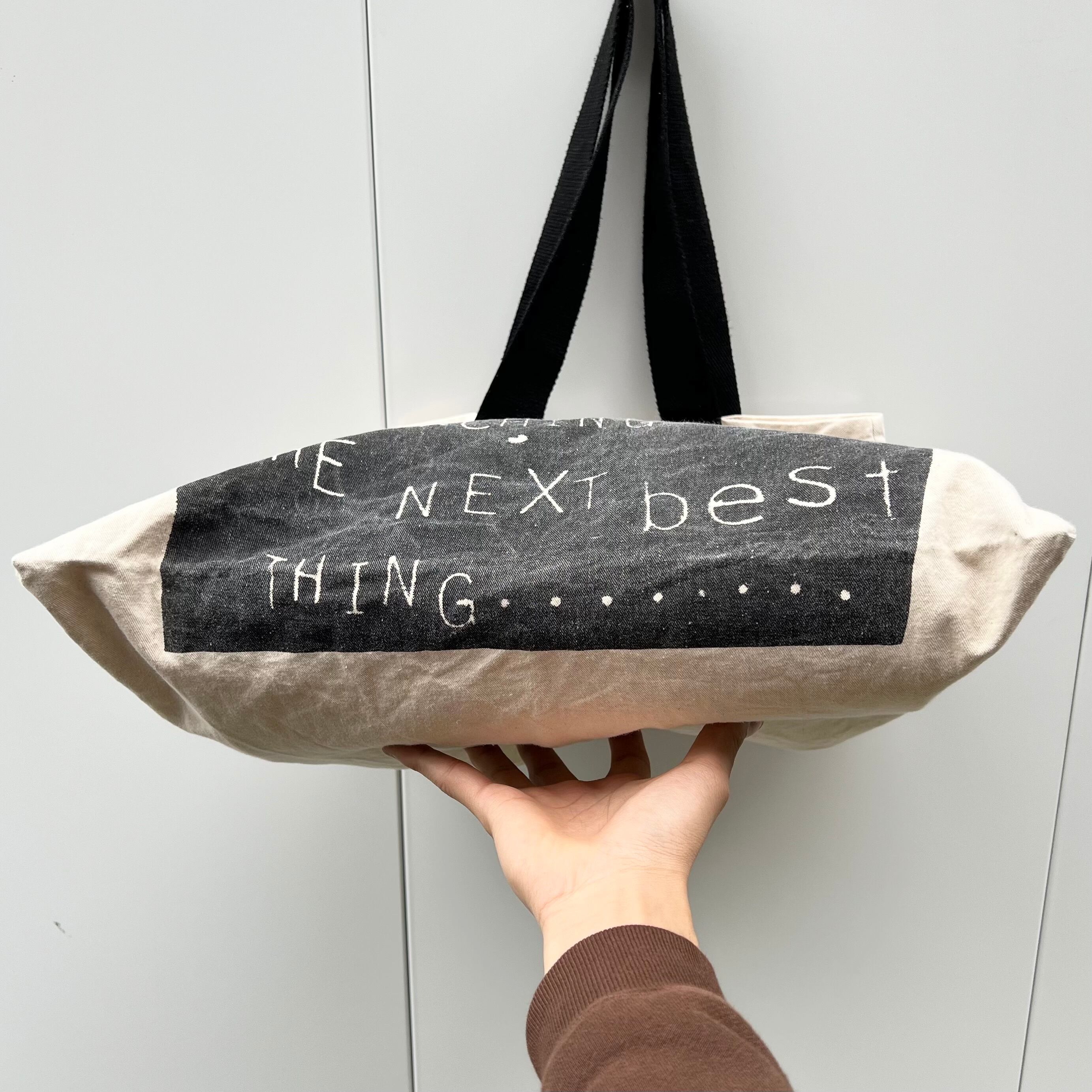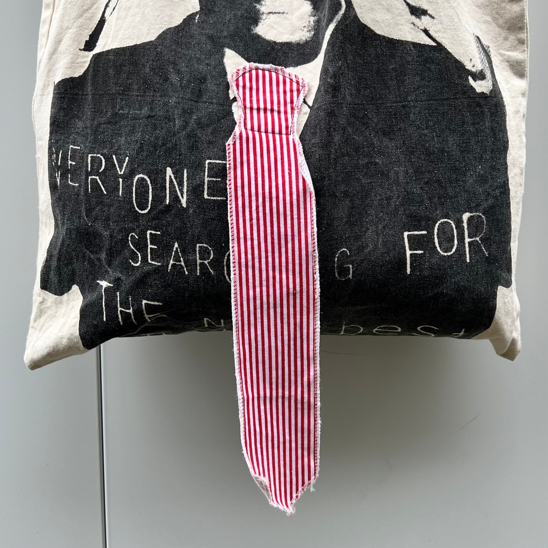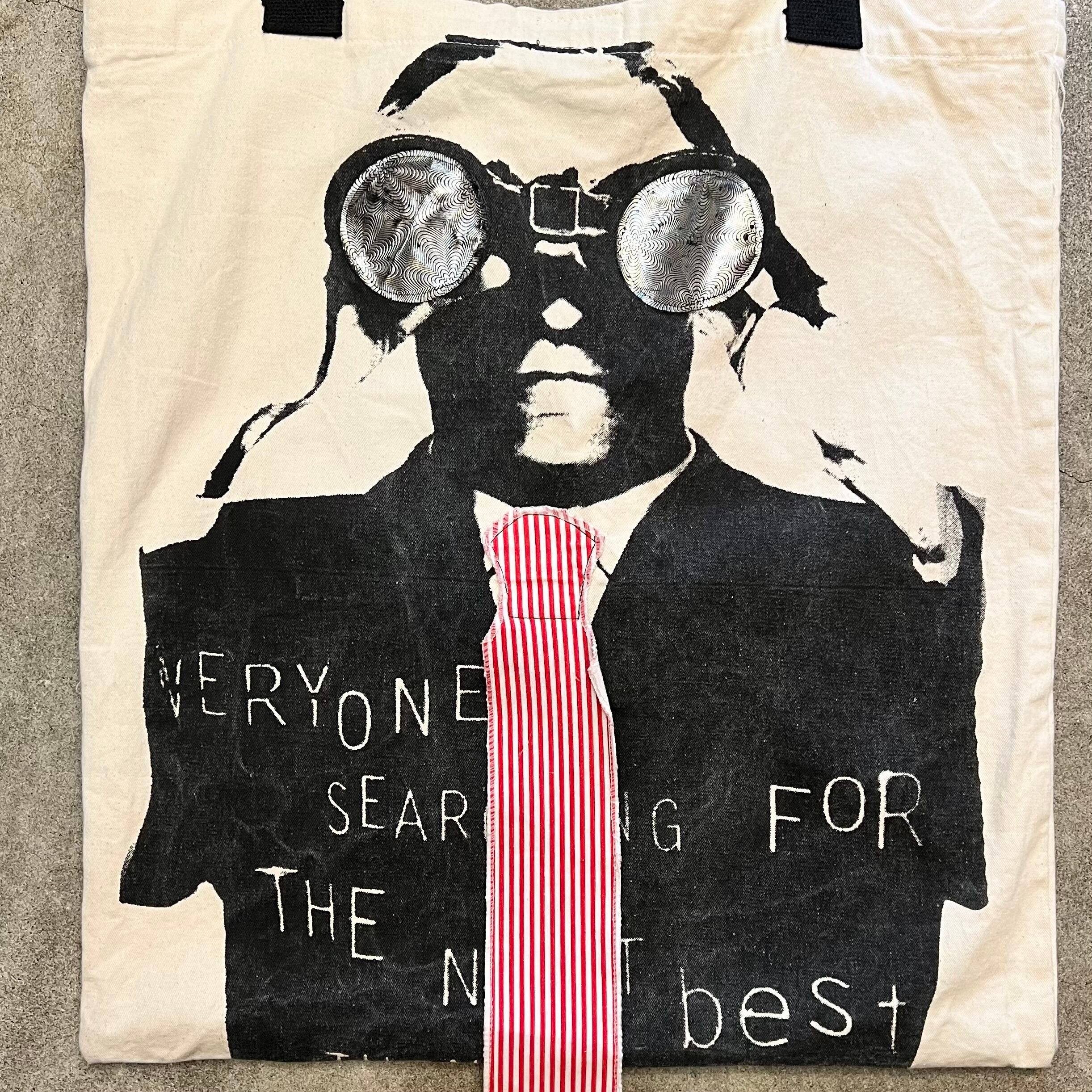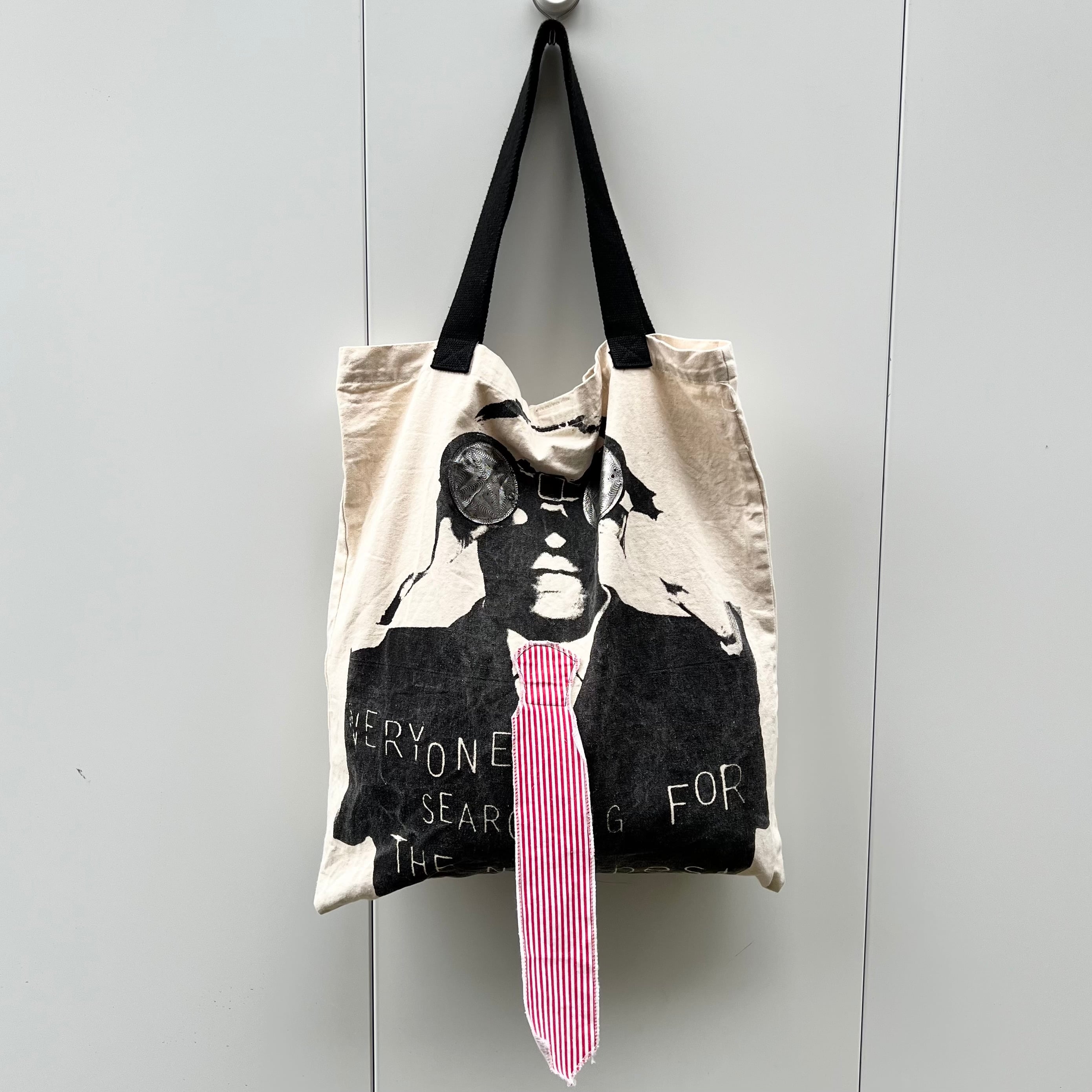 生成xブラックストラップのコットン素材、フロントに上半身プリント(EVERYONE'S SERCHING FOR THE NEXT BEST THING) 、双眼鏡とネクタイのみ柄生地を使用したトート型デザインです。