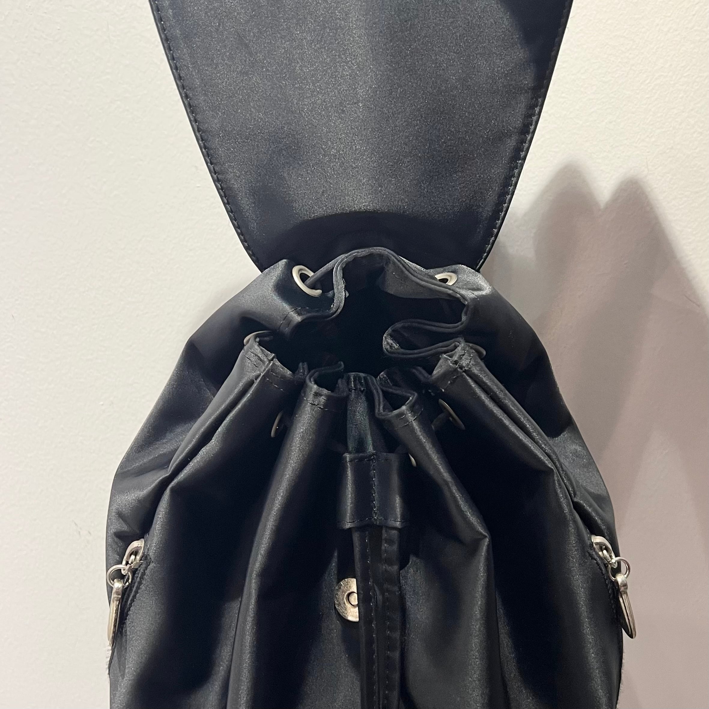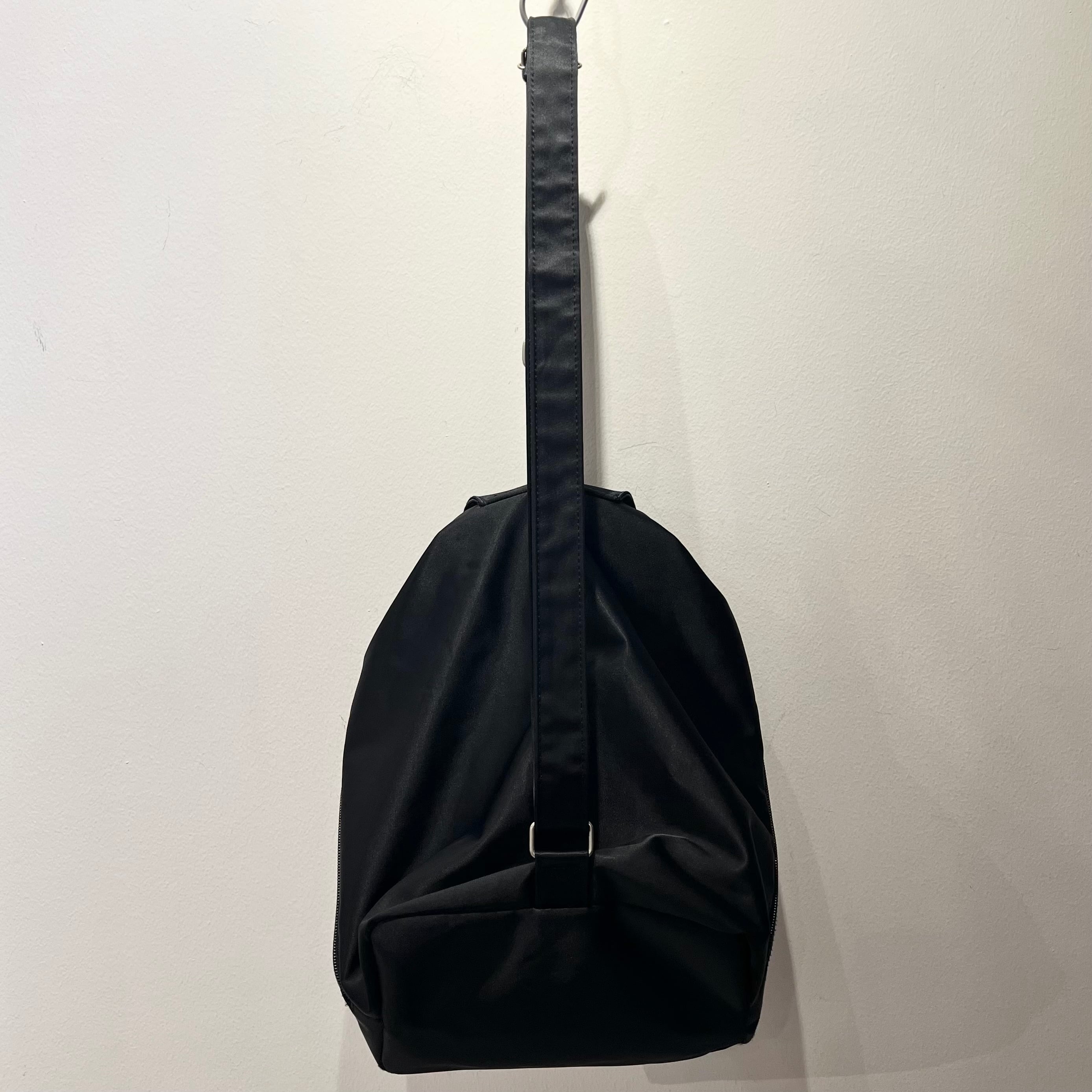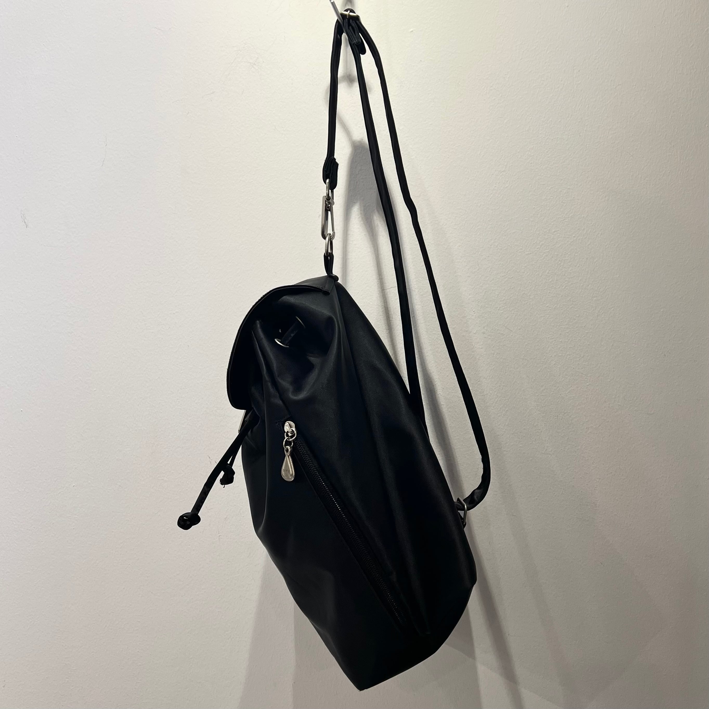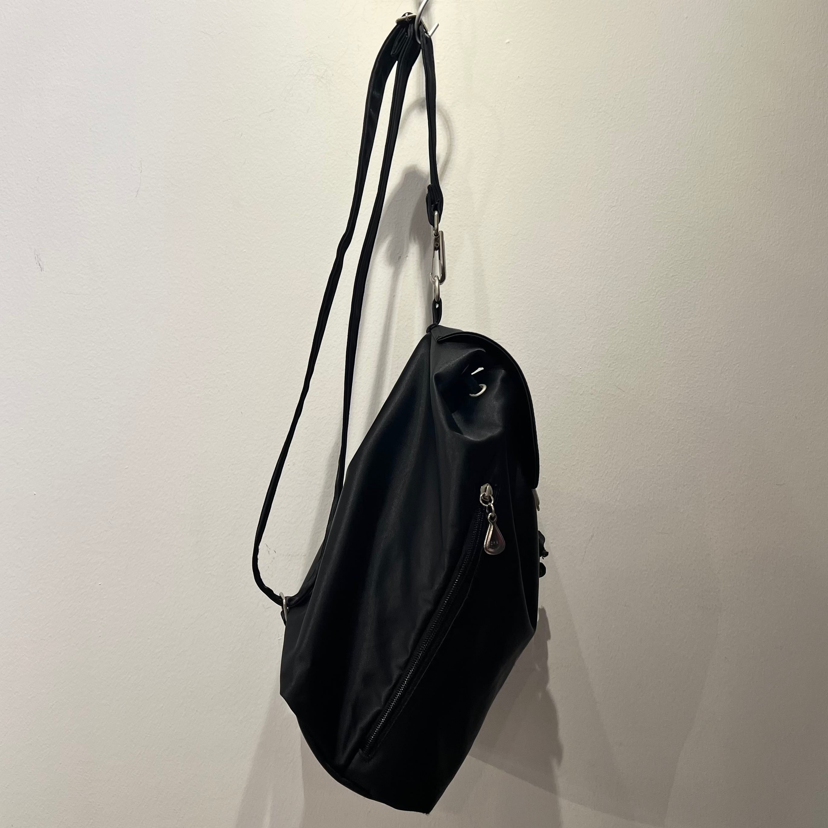 ブラックのナイロン系素材、ストラップのバックル、フラップのバックル、ジッパースライダーにロゴ入りを使用、フロントのフラップ、左サイドのジッパーで開閉するデザインです。