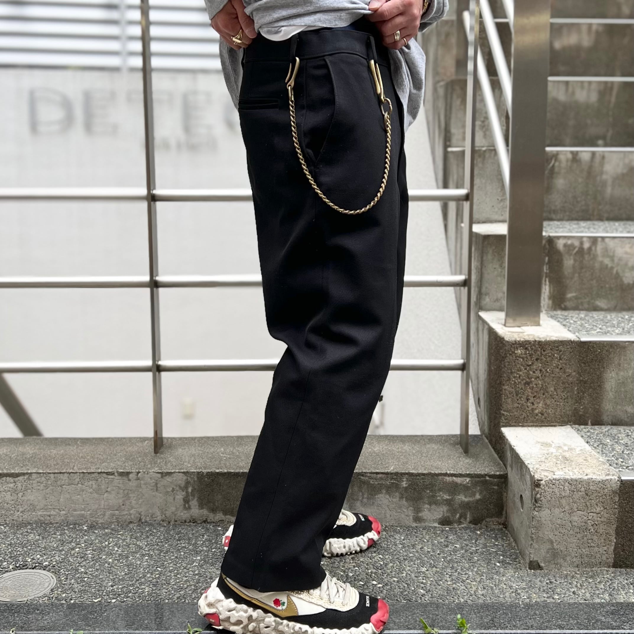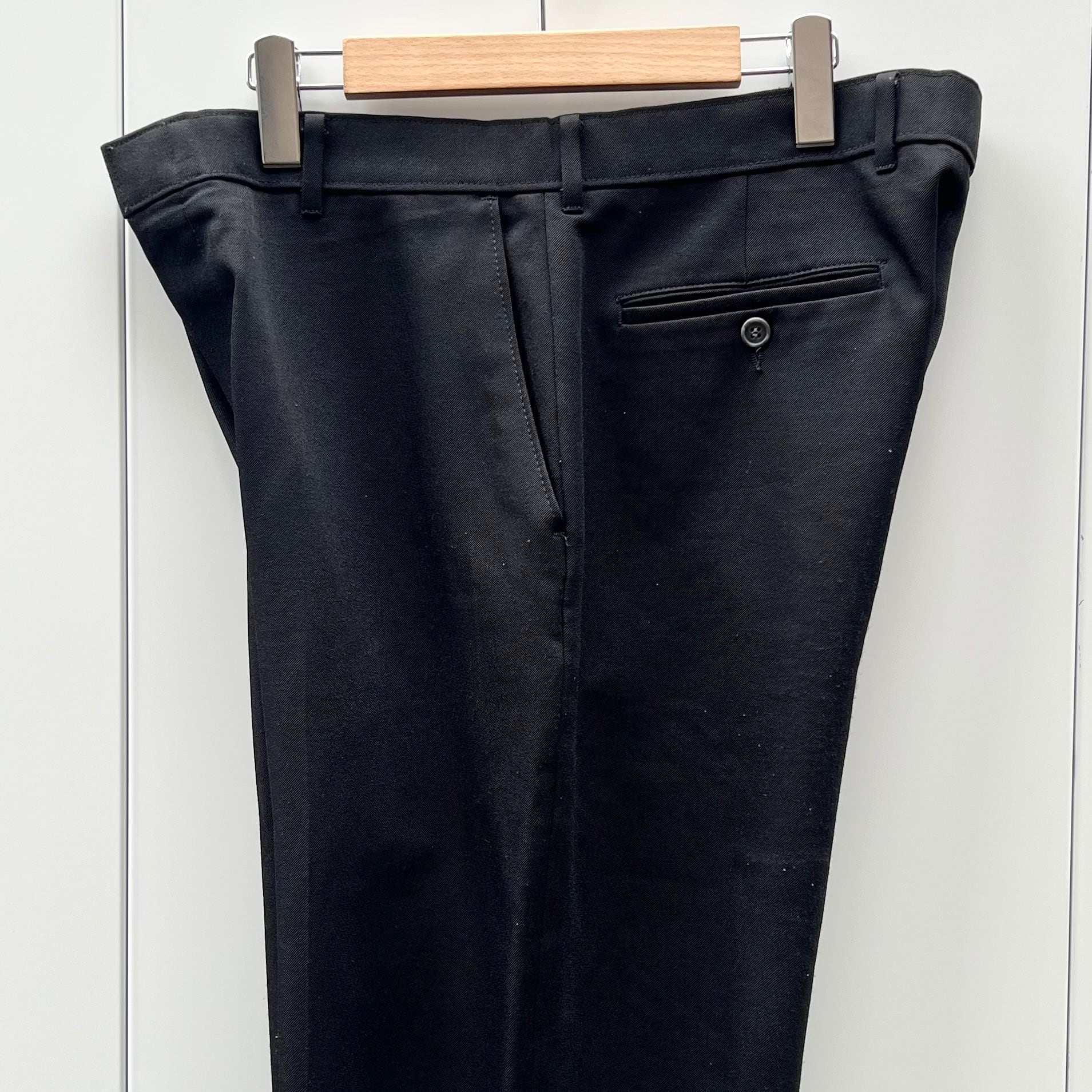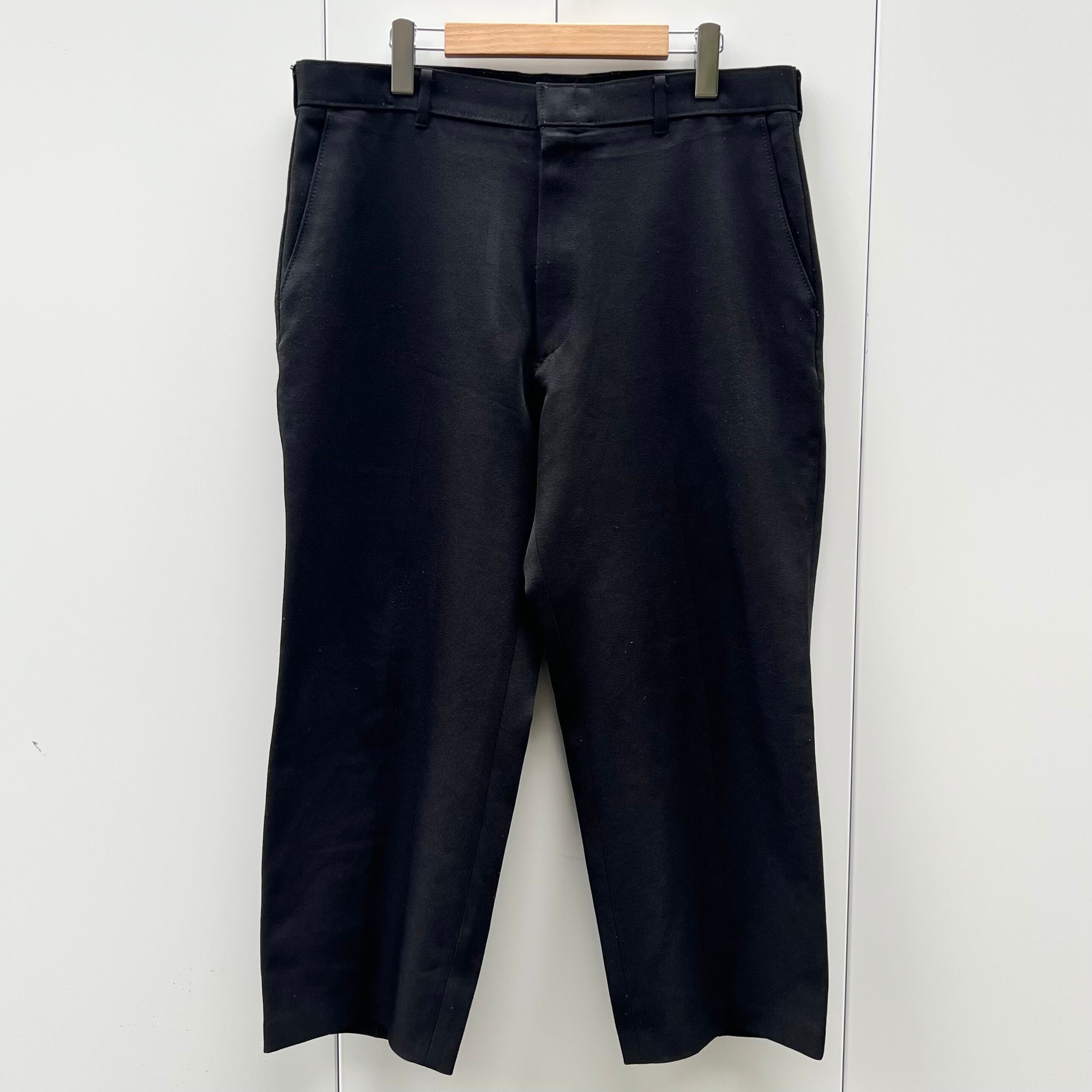 ブラックのポリエステル素材、センタープリーツのスラックス型のデザインです。