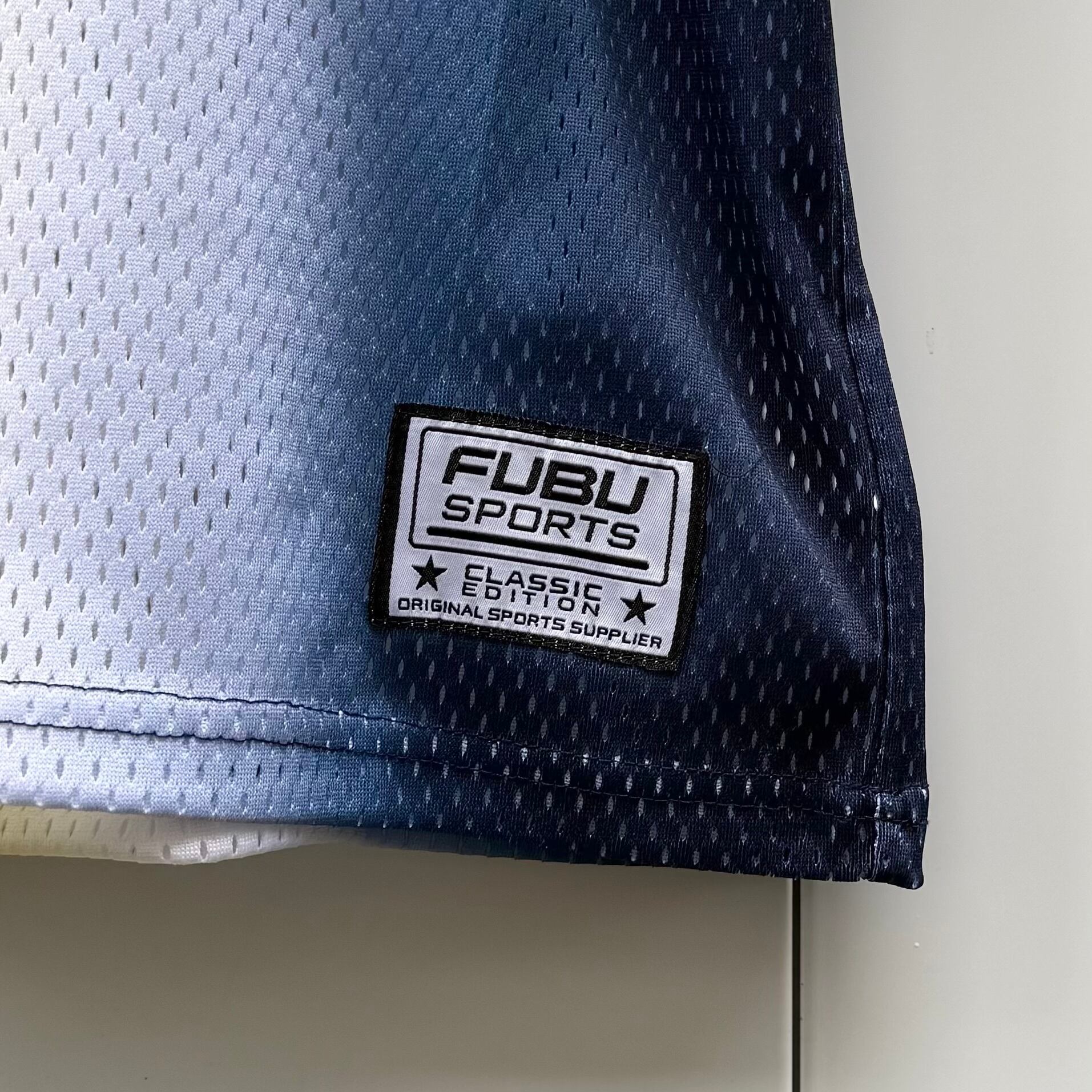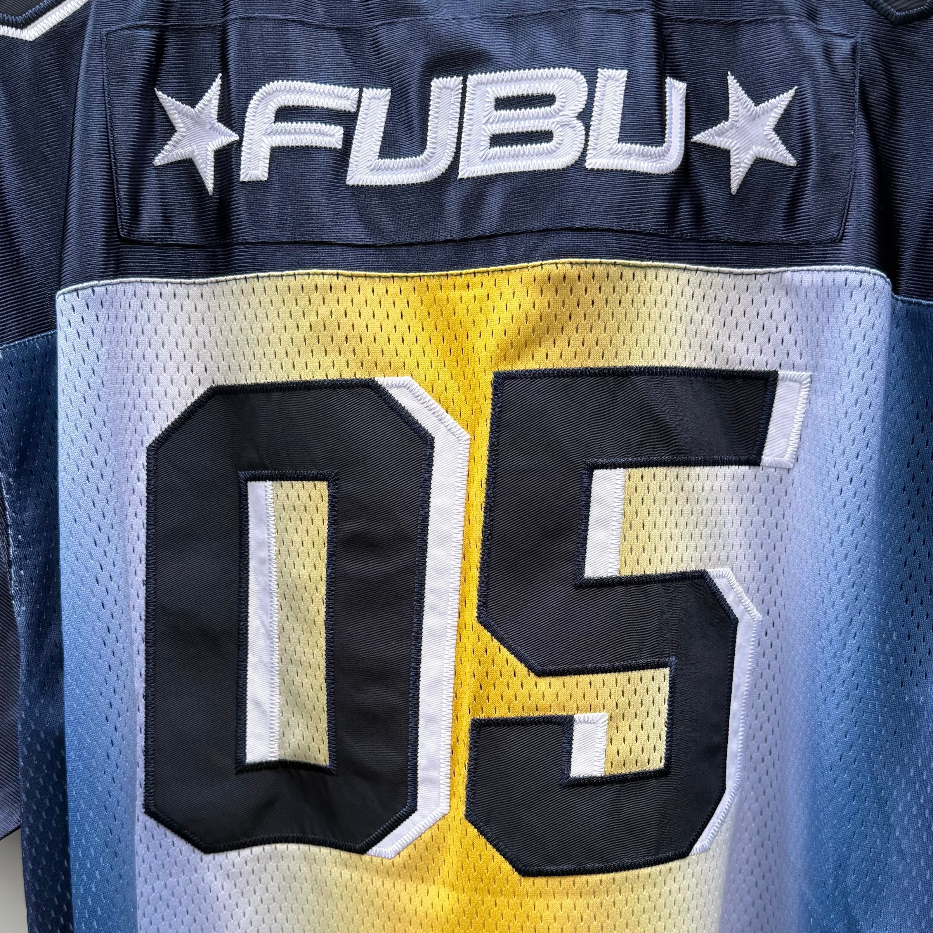 ネイビーxホワイト/イエローグラデーション、フロントに05ワッペン、左胸にFUBU刺繍、襟のリブにFUBU05刺繍、両肩に05ワッペン、バックにFUBU刺繍、05ワッペン、右袖にロゴマーク刺繍が入る豪華デザインです。