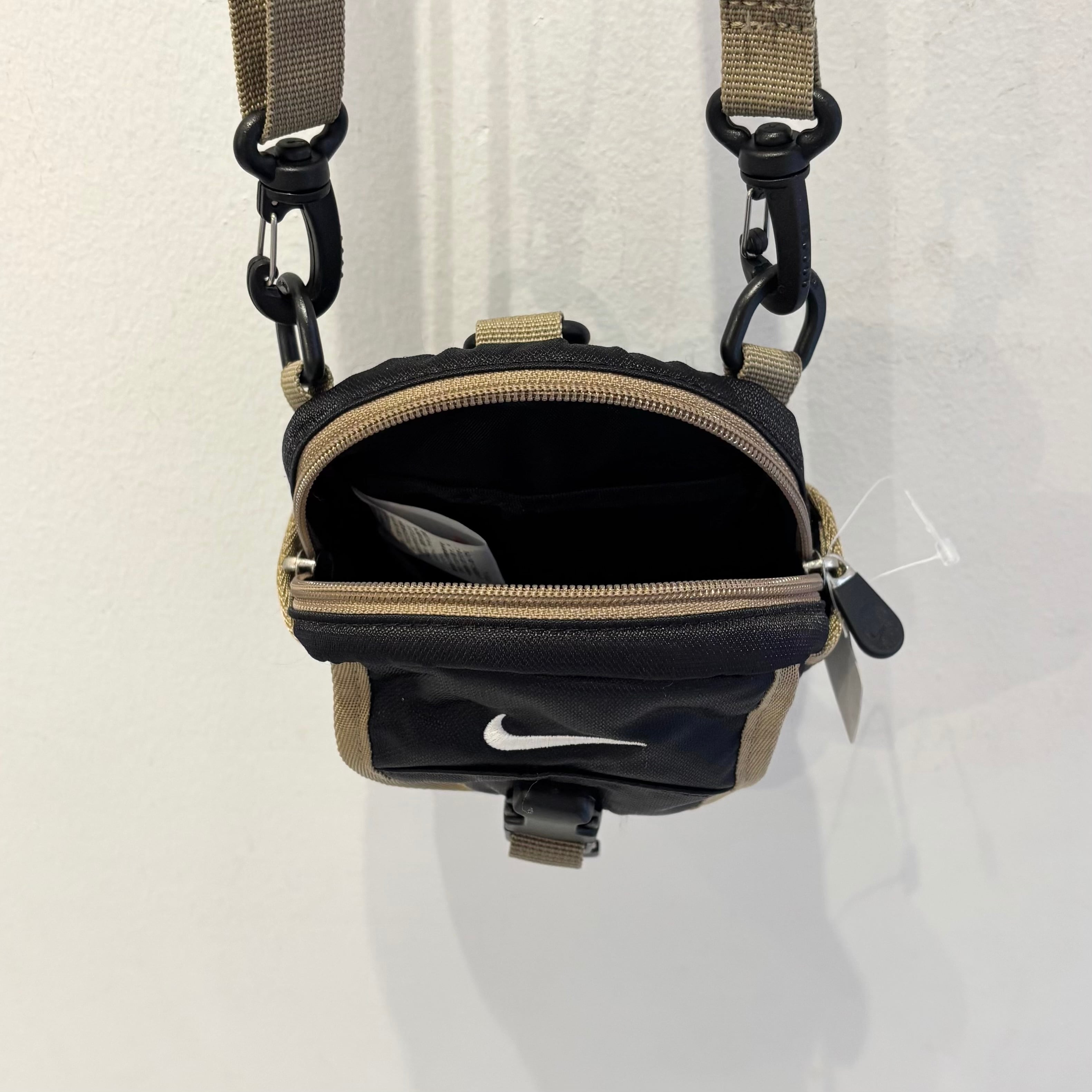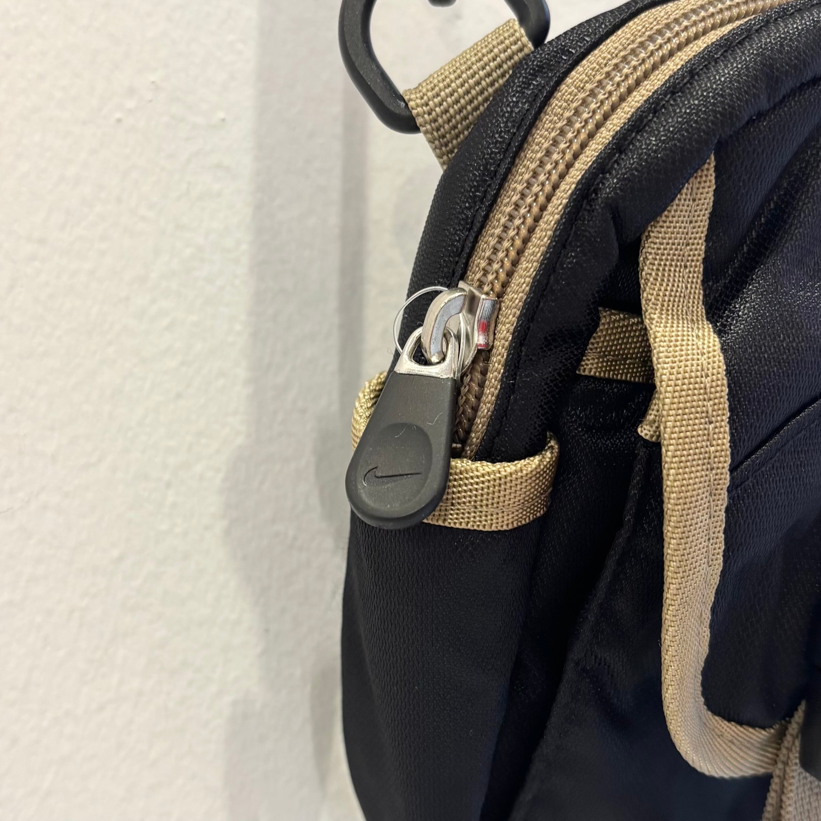 ブラックxベージュのナイロン系素材、フロントのフラップポケットにスウォッシュ刺繍、メインポケットとフラップで開閉のサブポケット、両サイドにサブポケット、脱着可脳なストラップ、背面にネーム付きベルトループ、カラビナが付いたデザインです。