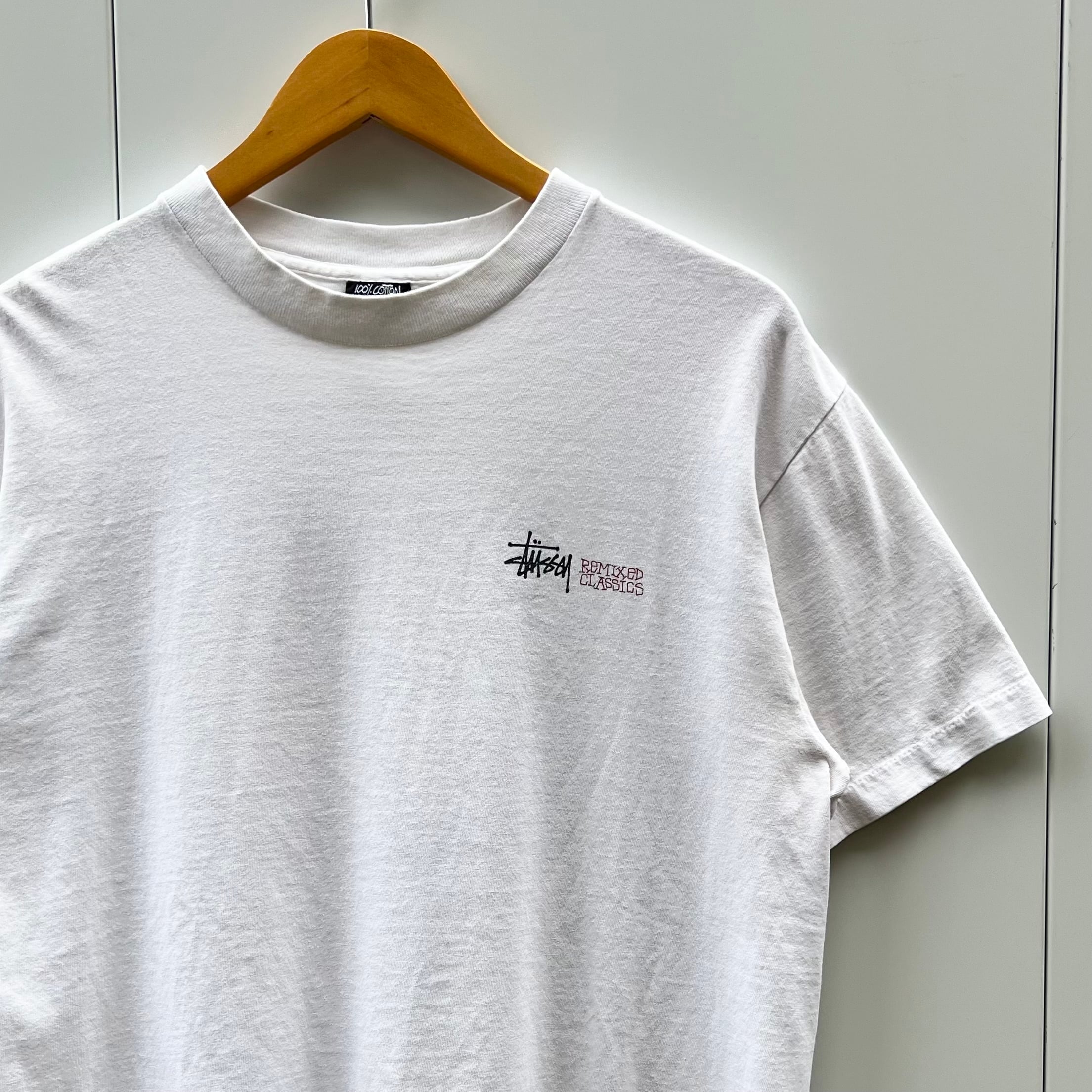 ホワイトのコットン素材、左胸にSTUSSY Remixed CLASSICSプリント、バックにフォトプリントが入るシンプルデザインです。
