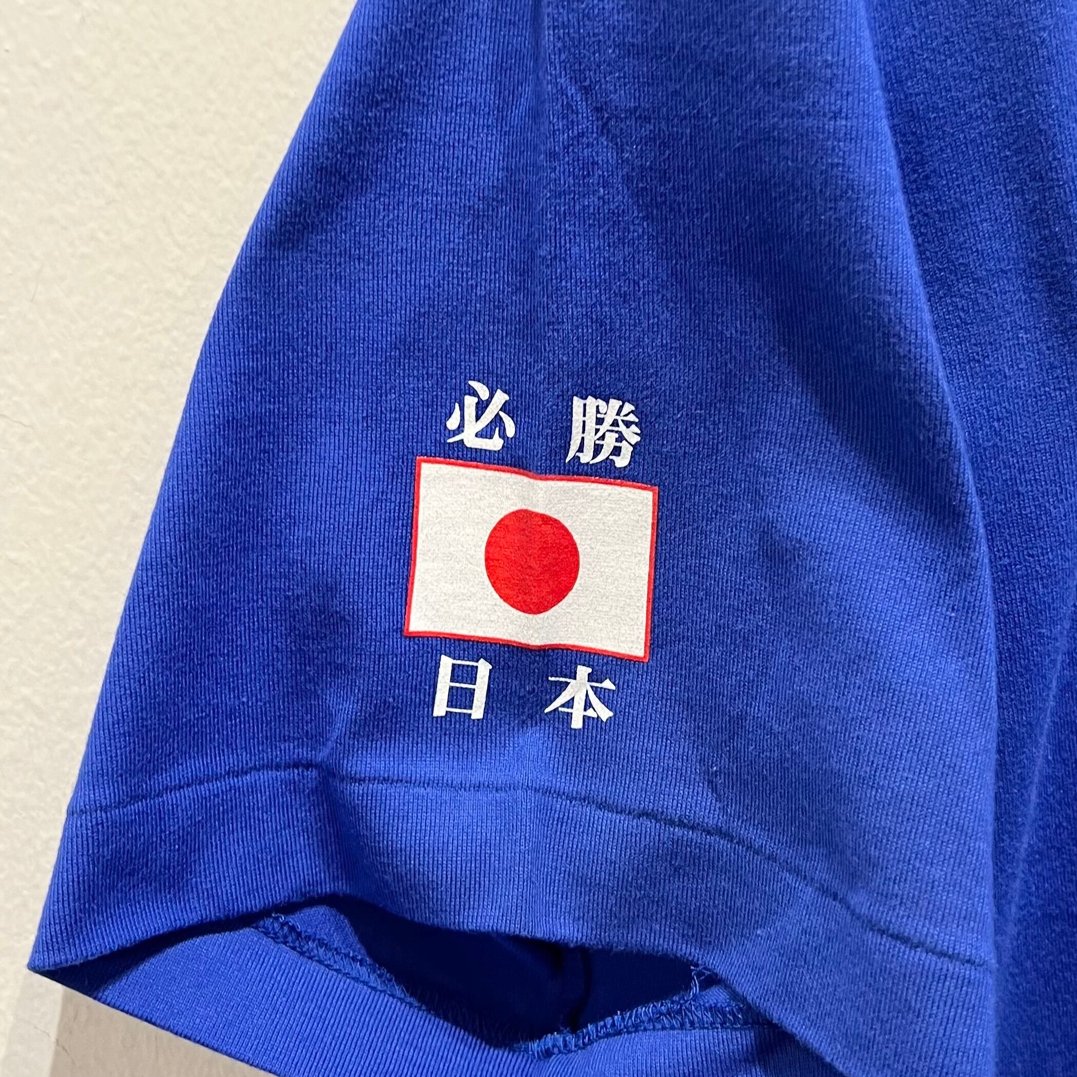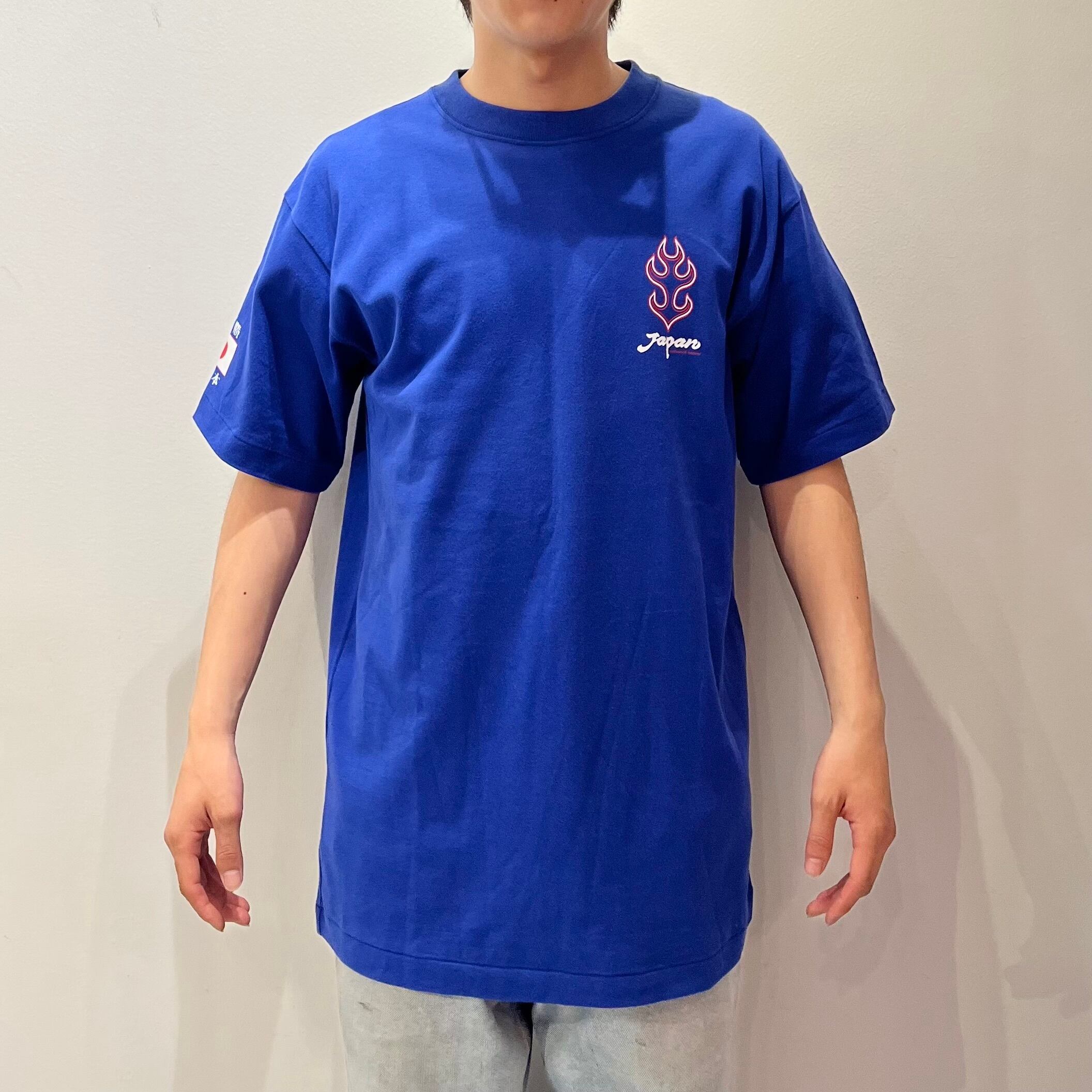 ブルーのコットン系素材、左胸にJapanと炎プリント、バックに大きくKAZU11プリントが入ったデザインです。