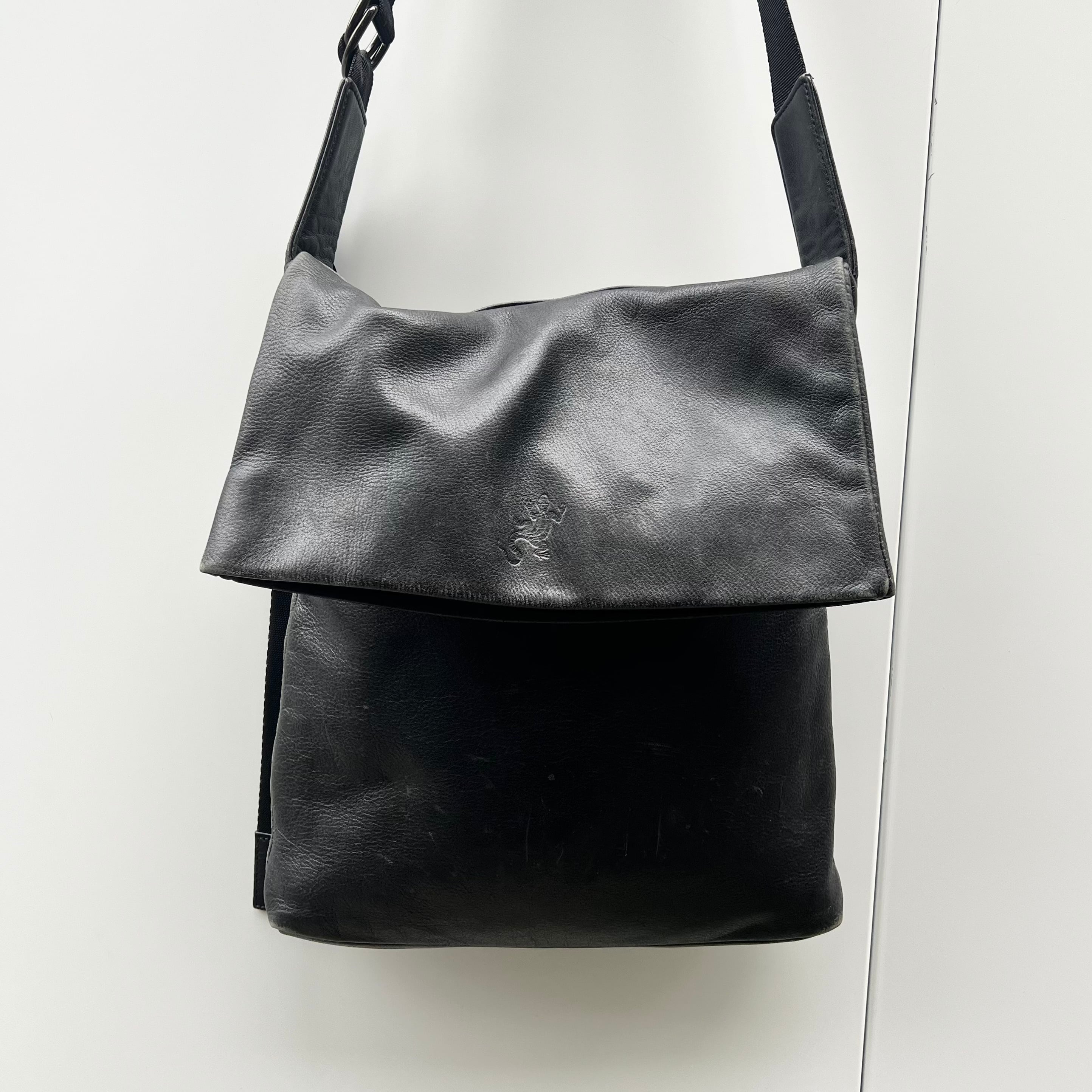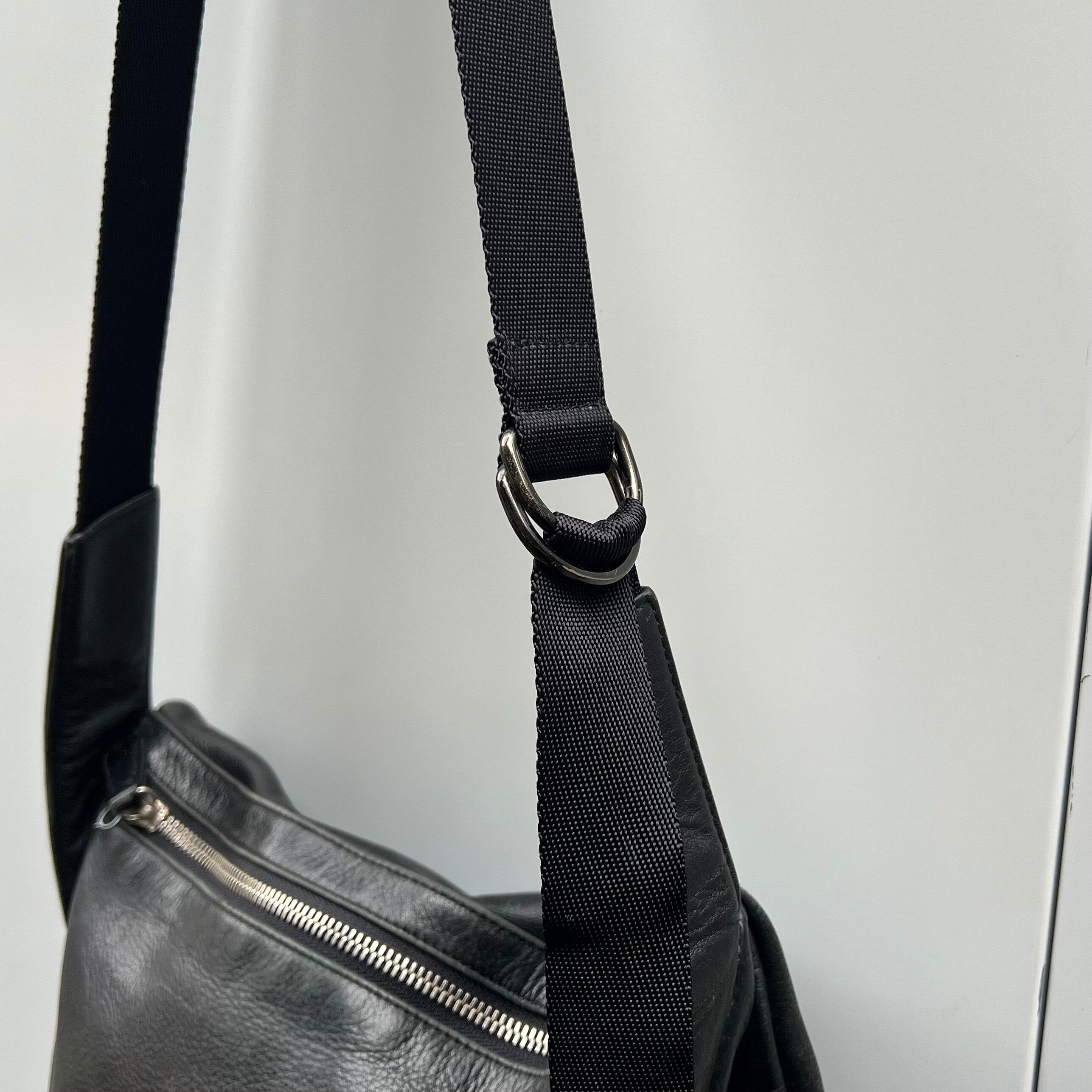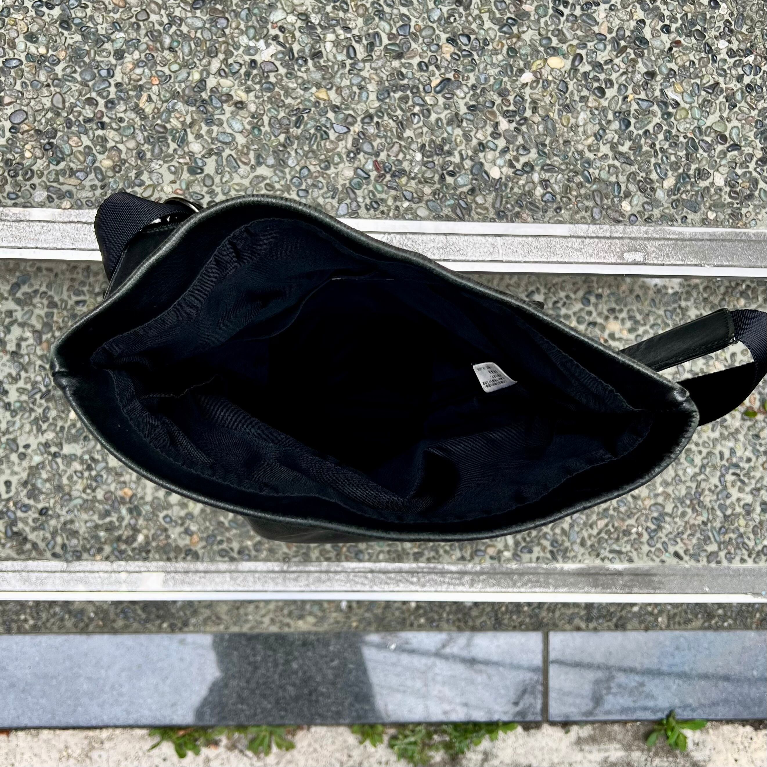 ブラックレザー、折りたたみのメインポケット、ジッパーで開閉のサブポケット、フロントに型押しロゴマーク、内ポケット、ナイロンストラップが付いたデザインです。