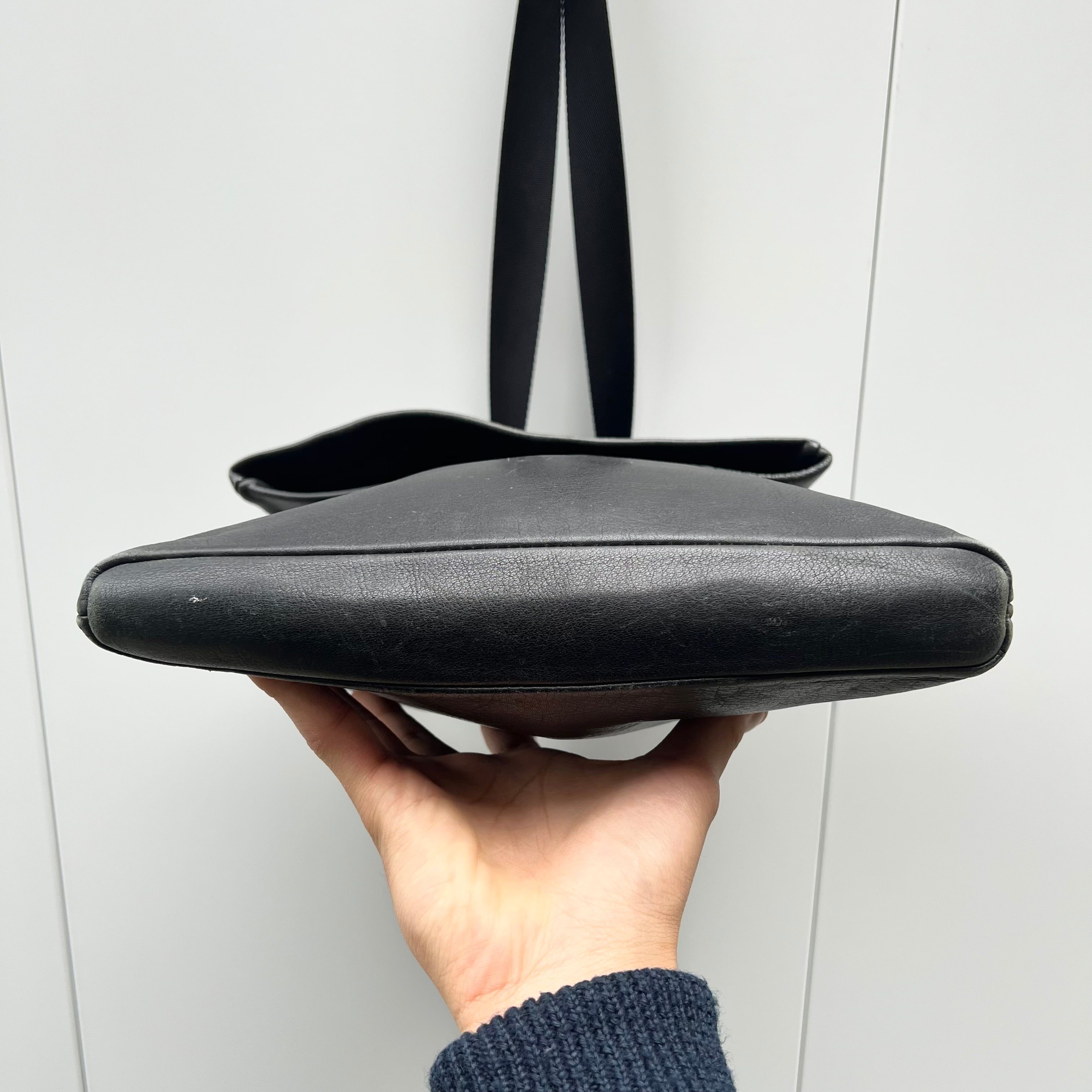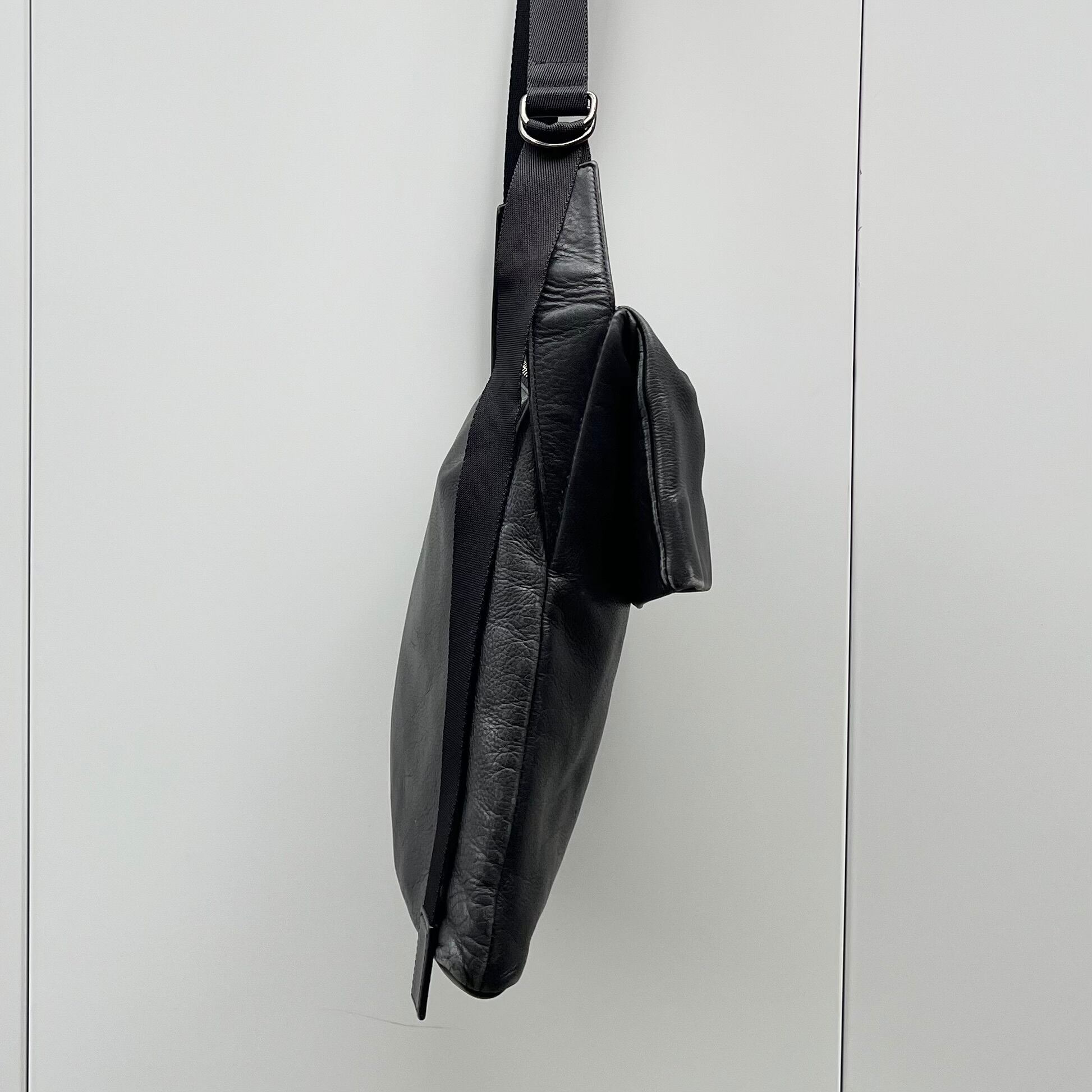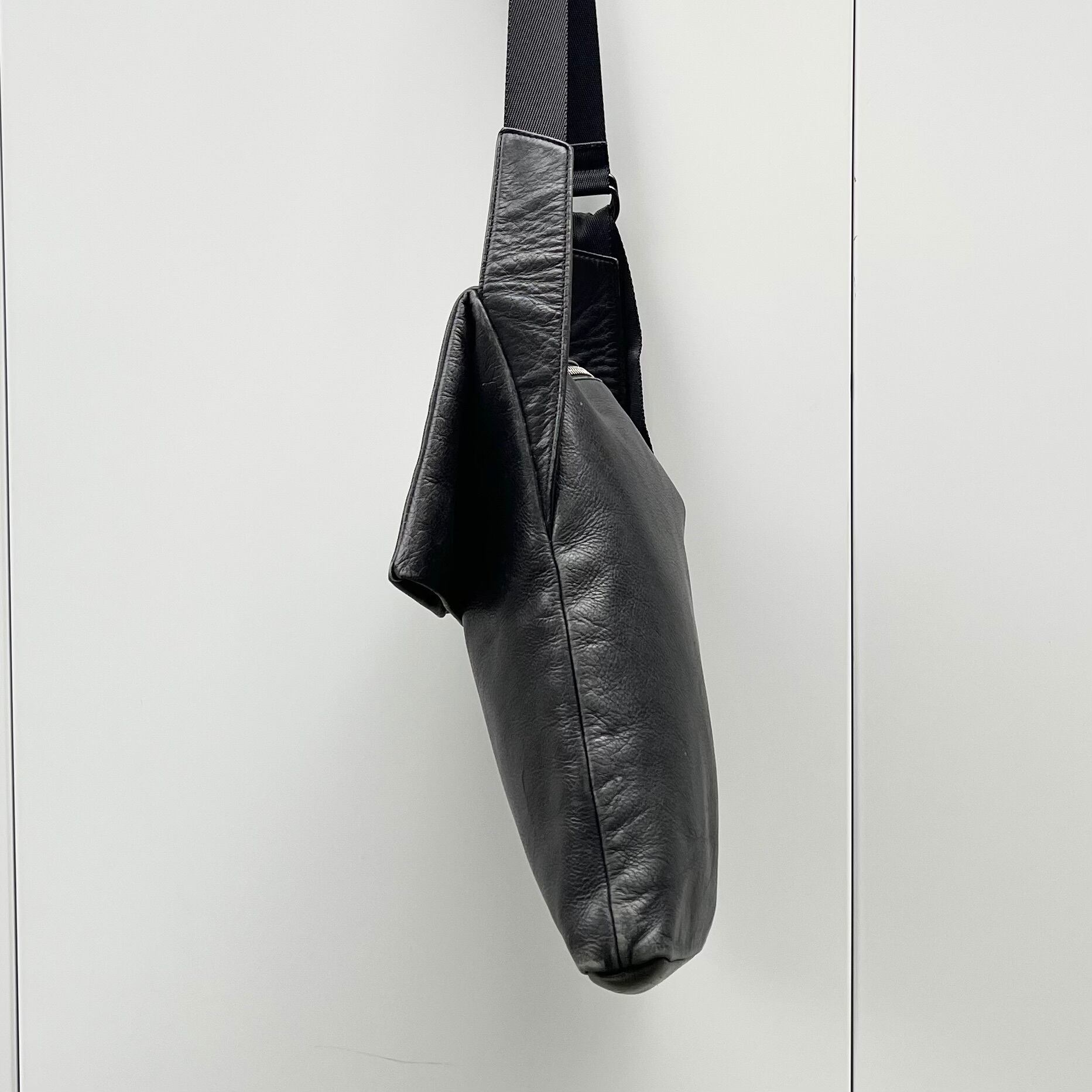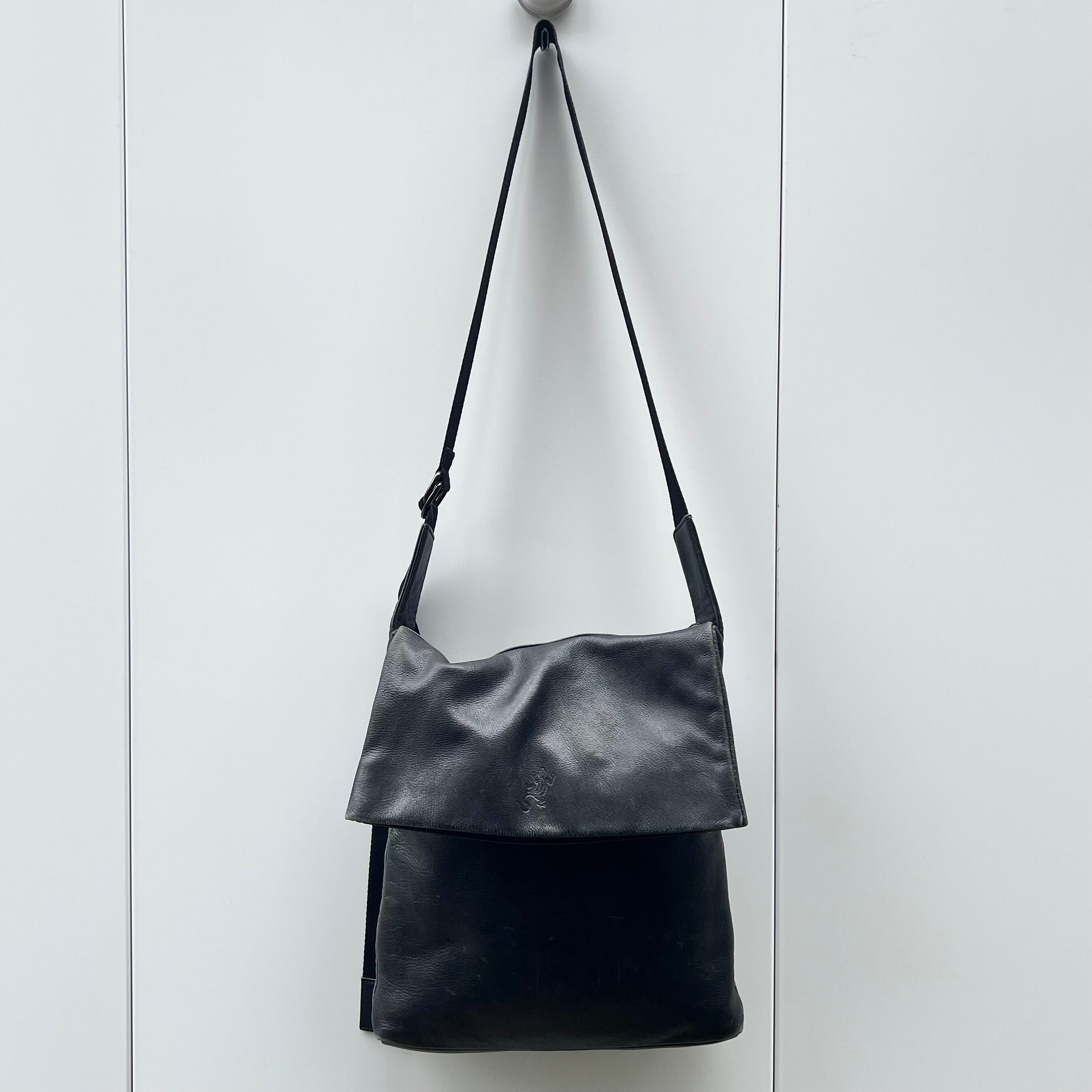ブラックレザー、折りたたみのメインポケット、ジッパーで開閉のサブポケット、フロントに型押しロゴマーク、内ポケット、ナイロンストラップが付いたデザインです。