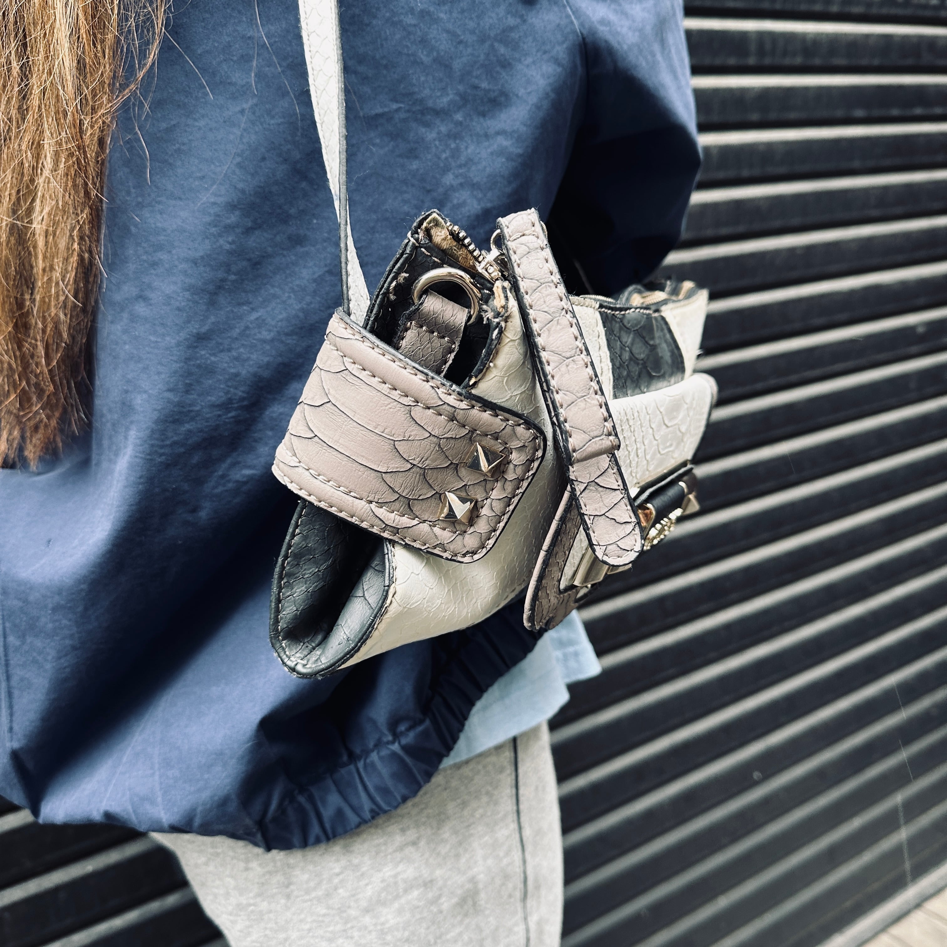 ホワイトxベージュxブラックのパイソン型押し柄、メインポケットとフロントのフラップ付きサブポケット、フロントのポケットにロゴ入りメタルチャーム、内ポケットの付いたデザインです。