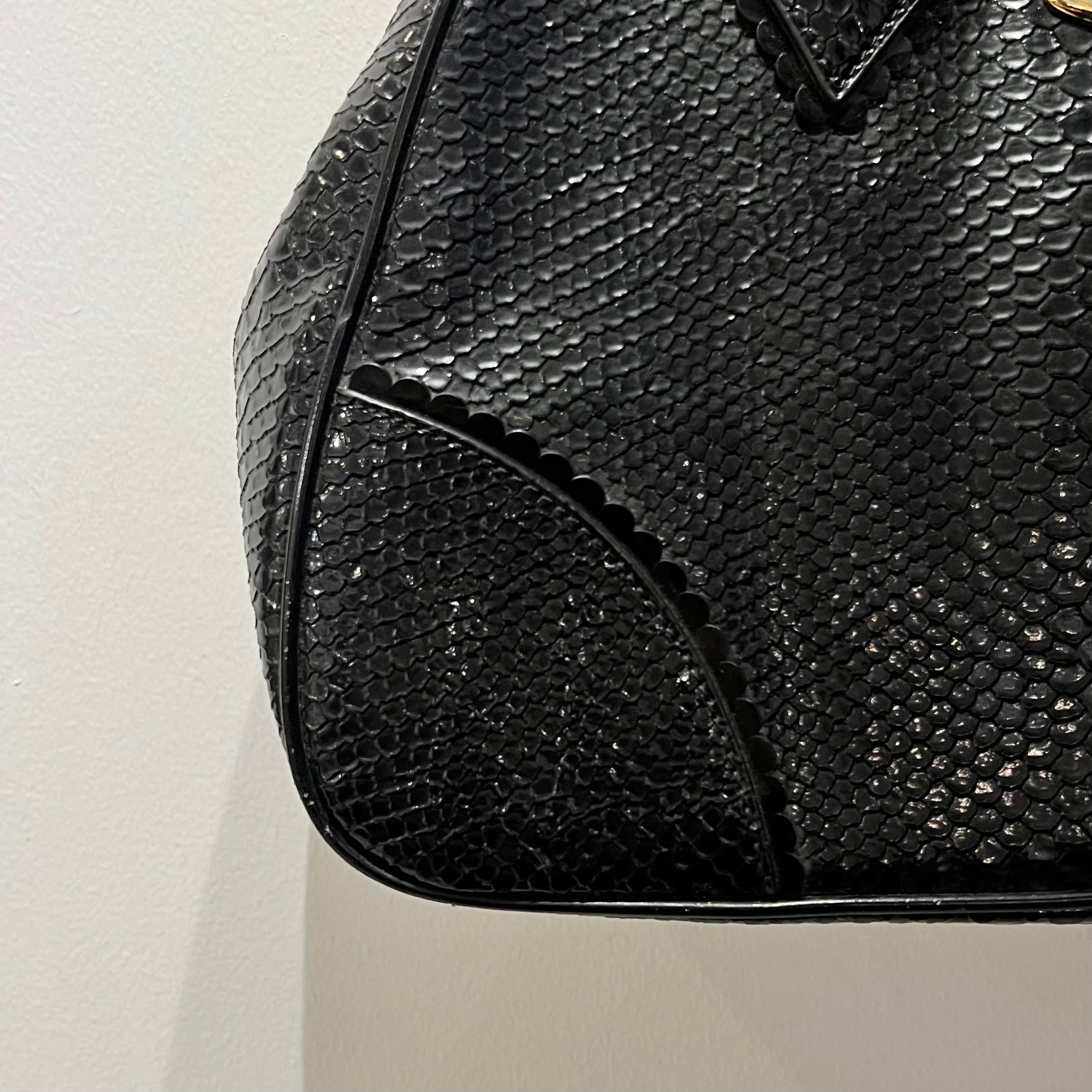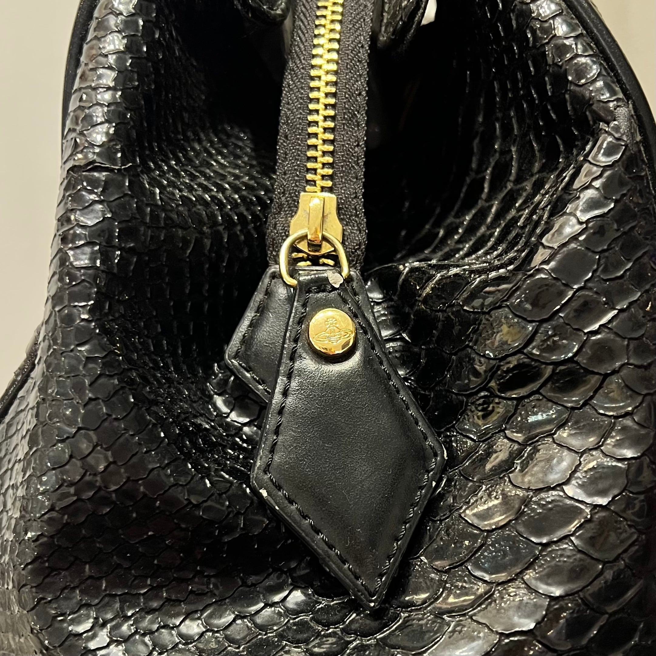 ブラックのクロコ柄型押しエナメル、フロントにメタルオーブ、オーブ入りリベット、オーブ入りジッパースライダー、オーブの総柄裏地、内ポケットの付いたボストン型デザインです。