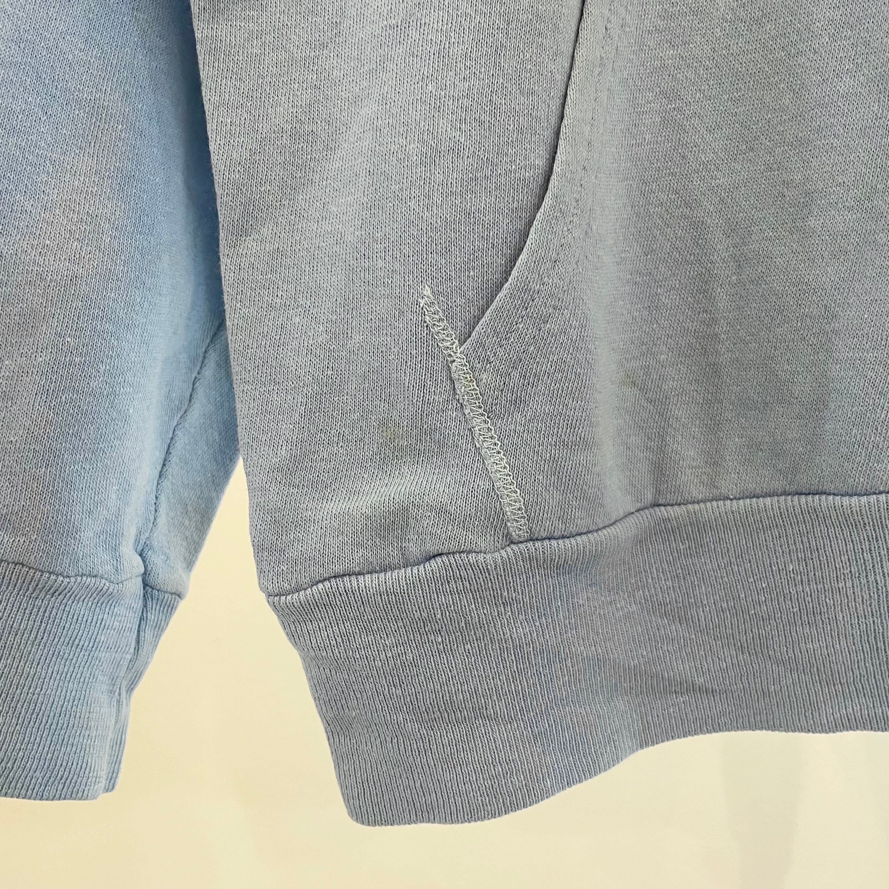 サックスブルーの裏起毛素材、左胸にロゴプリント、カンガルーポケット、ラグランスリーブのデザインです。