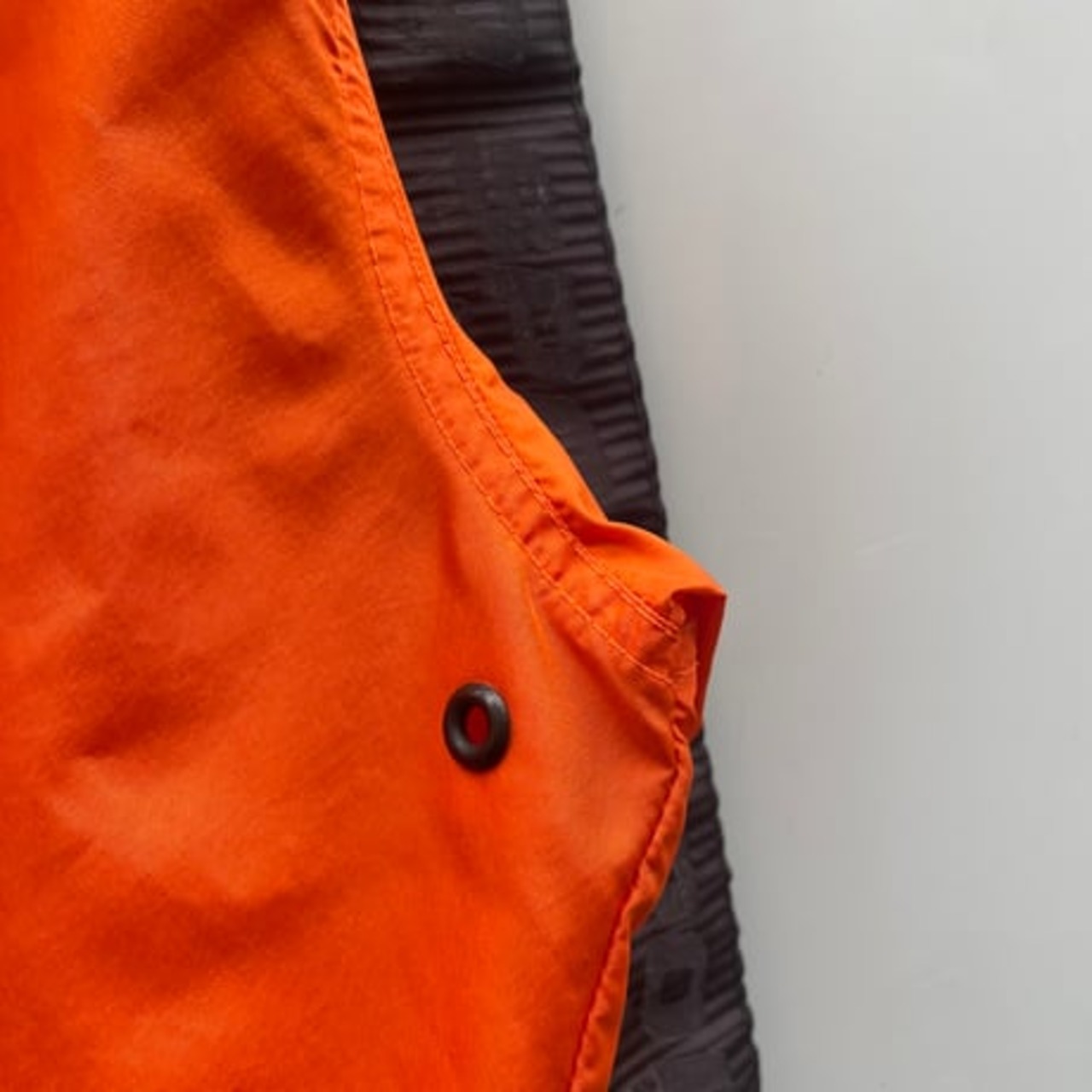 オレンジxブラックのナイロン素材、左裾にロゴネーム、肩から袖にかけてロゴテープ、カンガルーポケット、フードと裾にドローコードが入るデザインです。