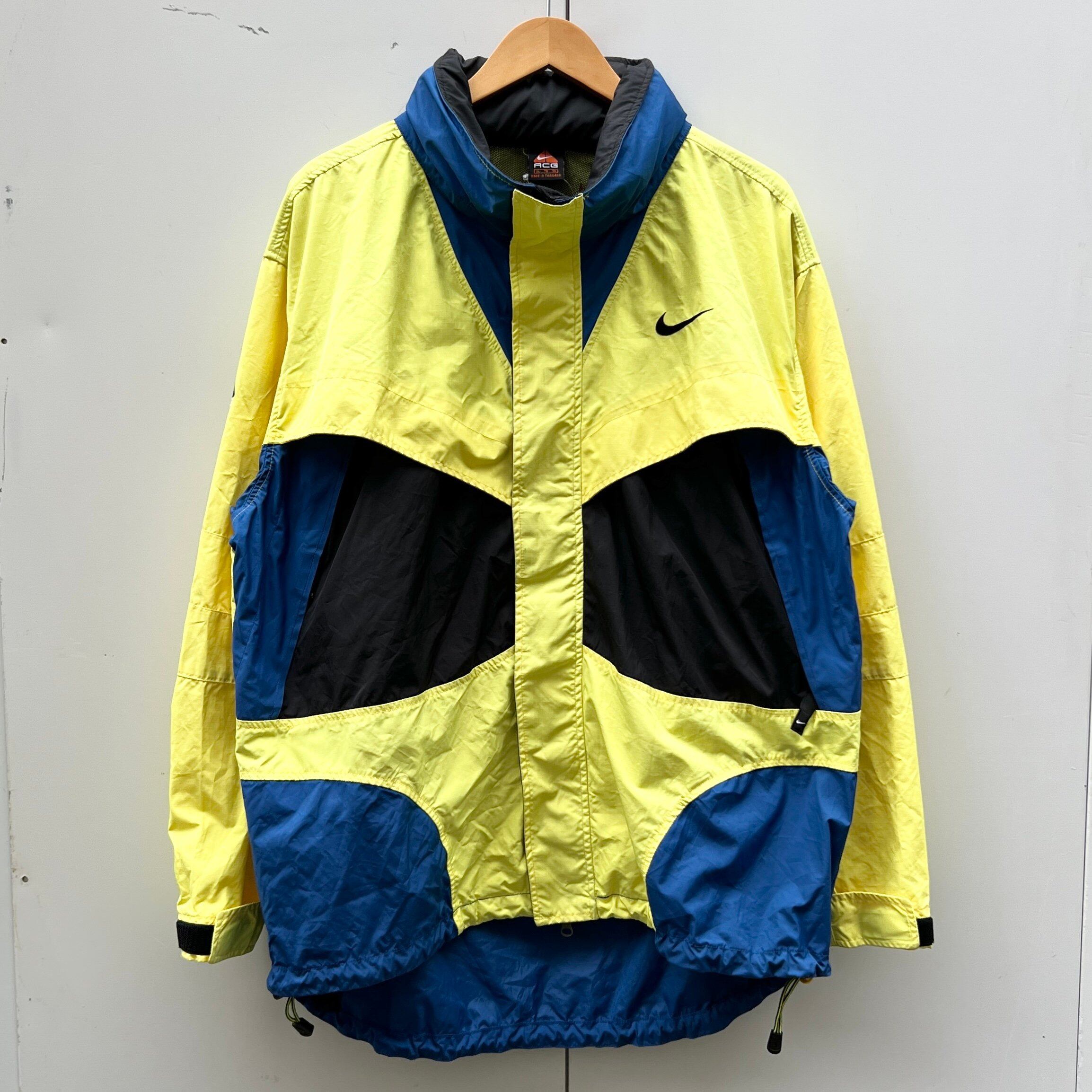イエローxブルーxブラックのポリエステル素材、左胸にスウォッシュ刺繍、右袖にACGロゴ刺繍、襟にフード収納、マンパ型のデザインです。