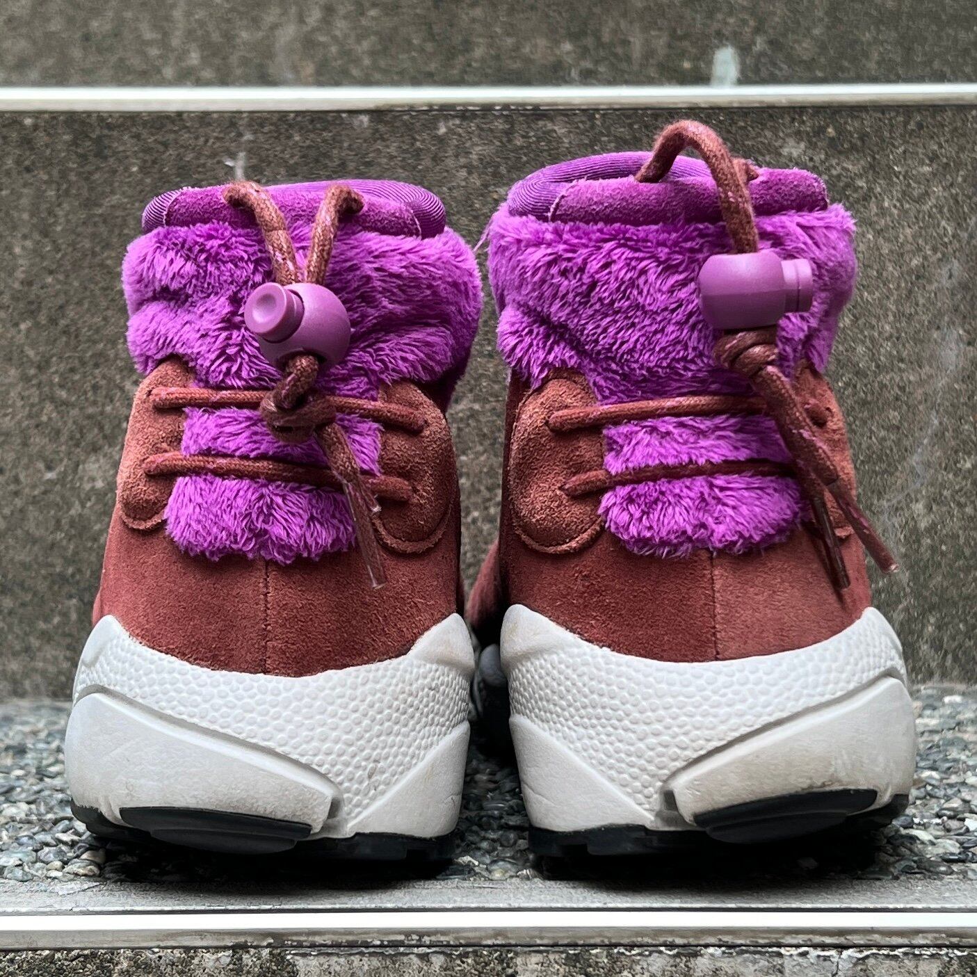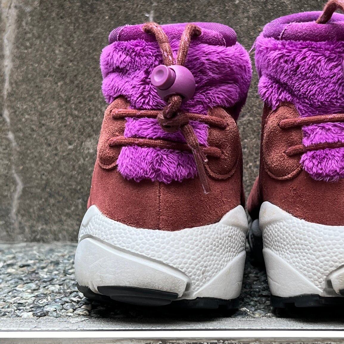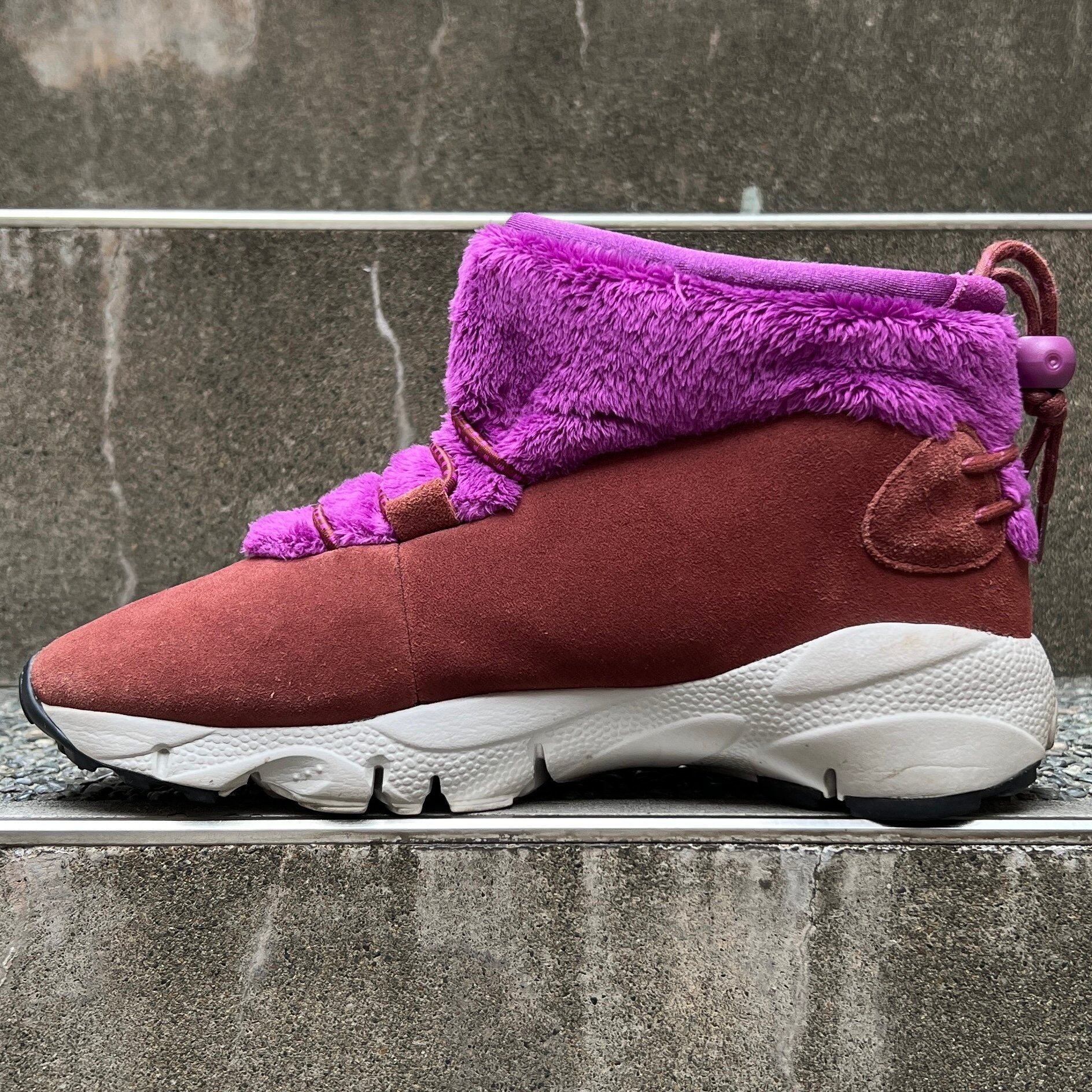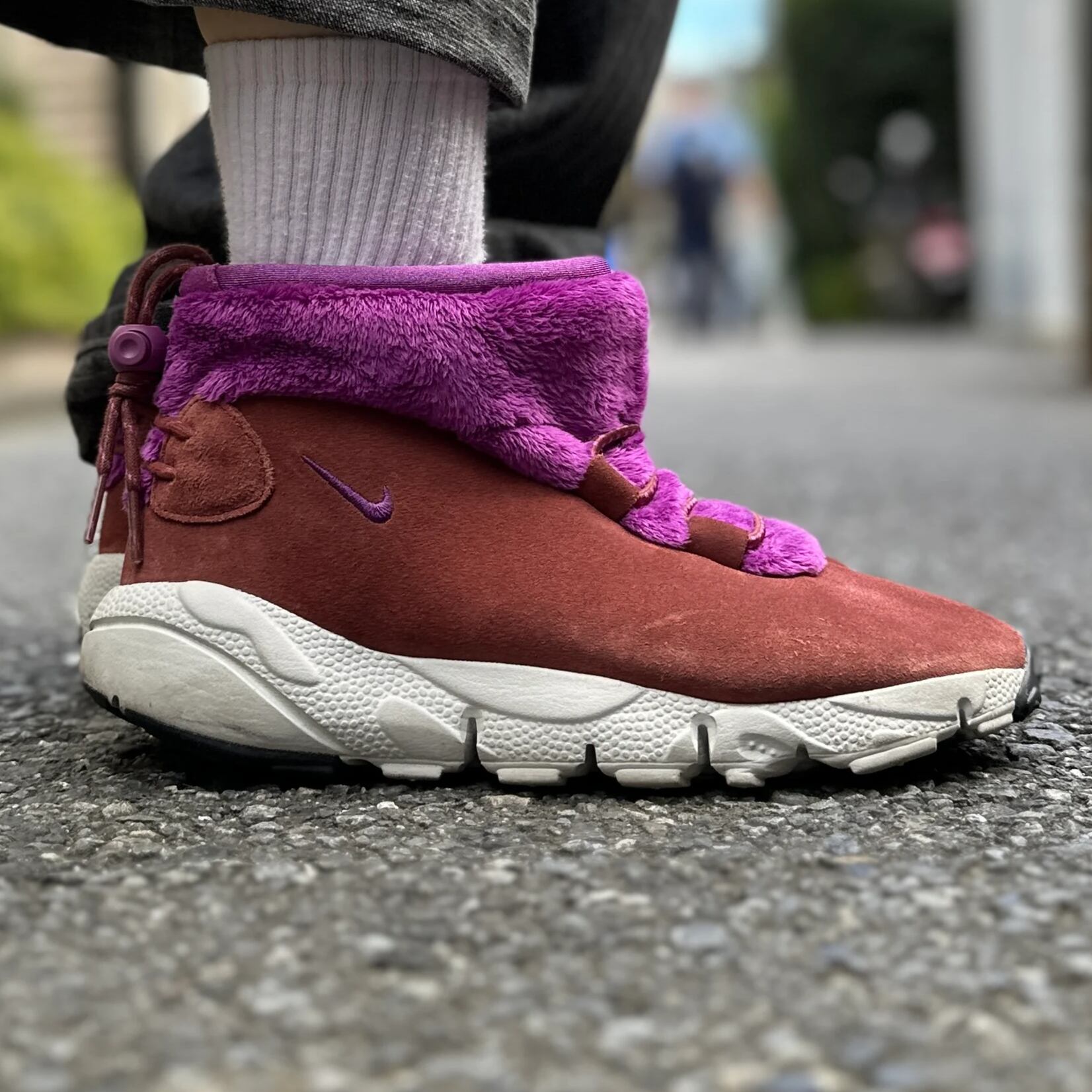 マルーンスウェードxパープルボア、サイドにスウォッシュ刺繍、ヒールにスピンドル、アジャスター付き、フットスケープソールを履いたチャッカタイプのデザインです。