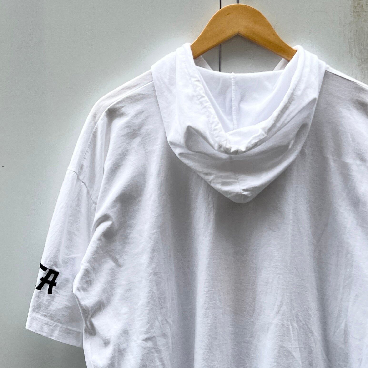 ホワイトのコットン天竺系素材、フロント中央にロゴ刺繍、その周りに単色でロゴプリント列、左袖にAACA刺繍、左裾にロゴネーム、フードの付いたTシャツ型デザインです。