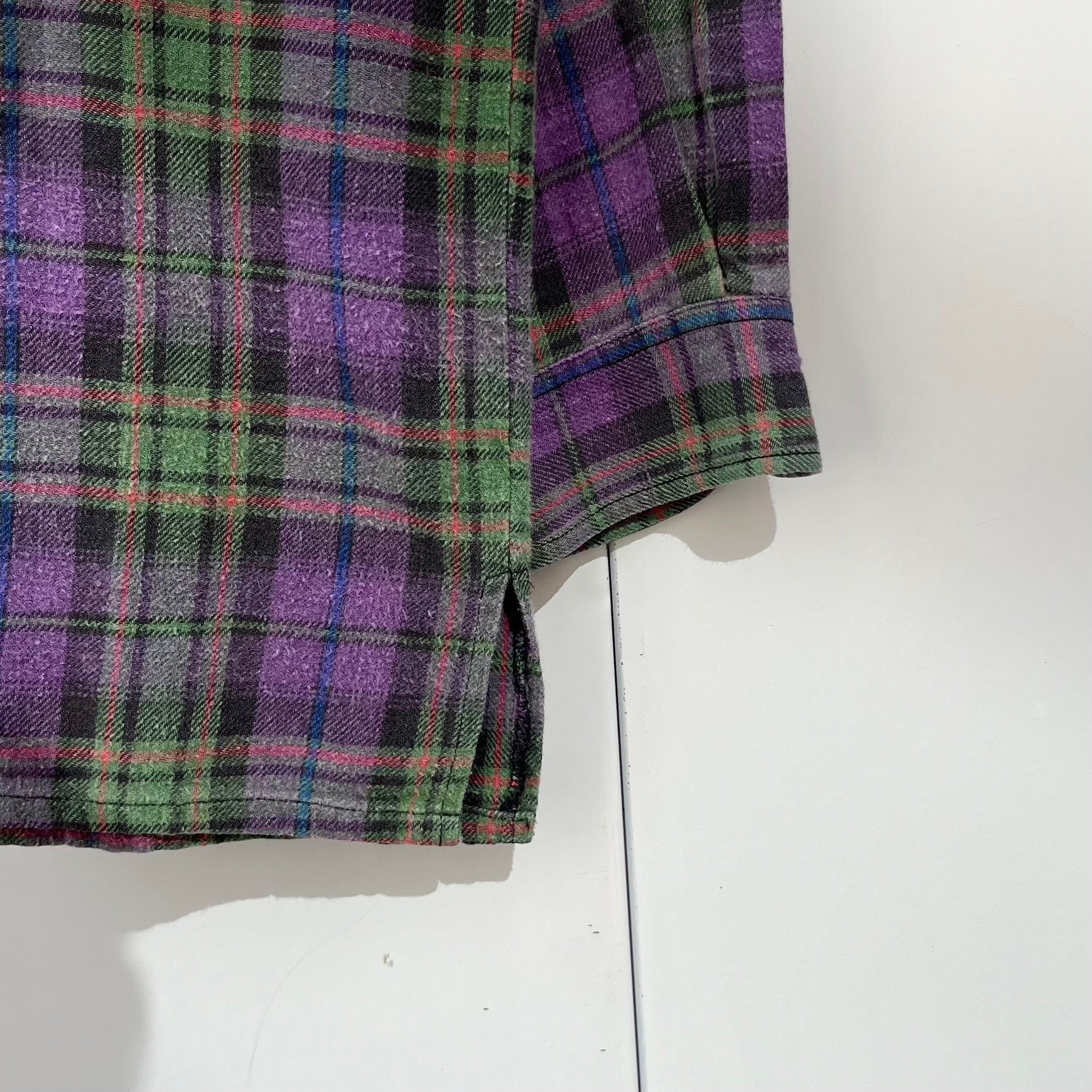 パープル/グリーン系のフランネルチェック素材xネイビーコーデュロイ、前立て中央にロゴネーム、右にフラップ付き、左にペン差し付きポケットが付いたデザインです。