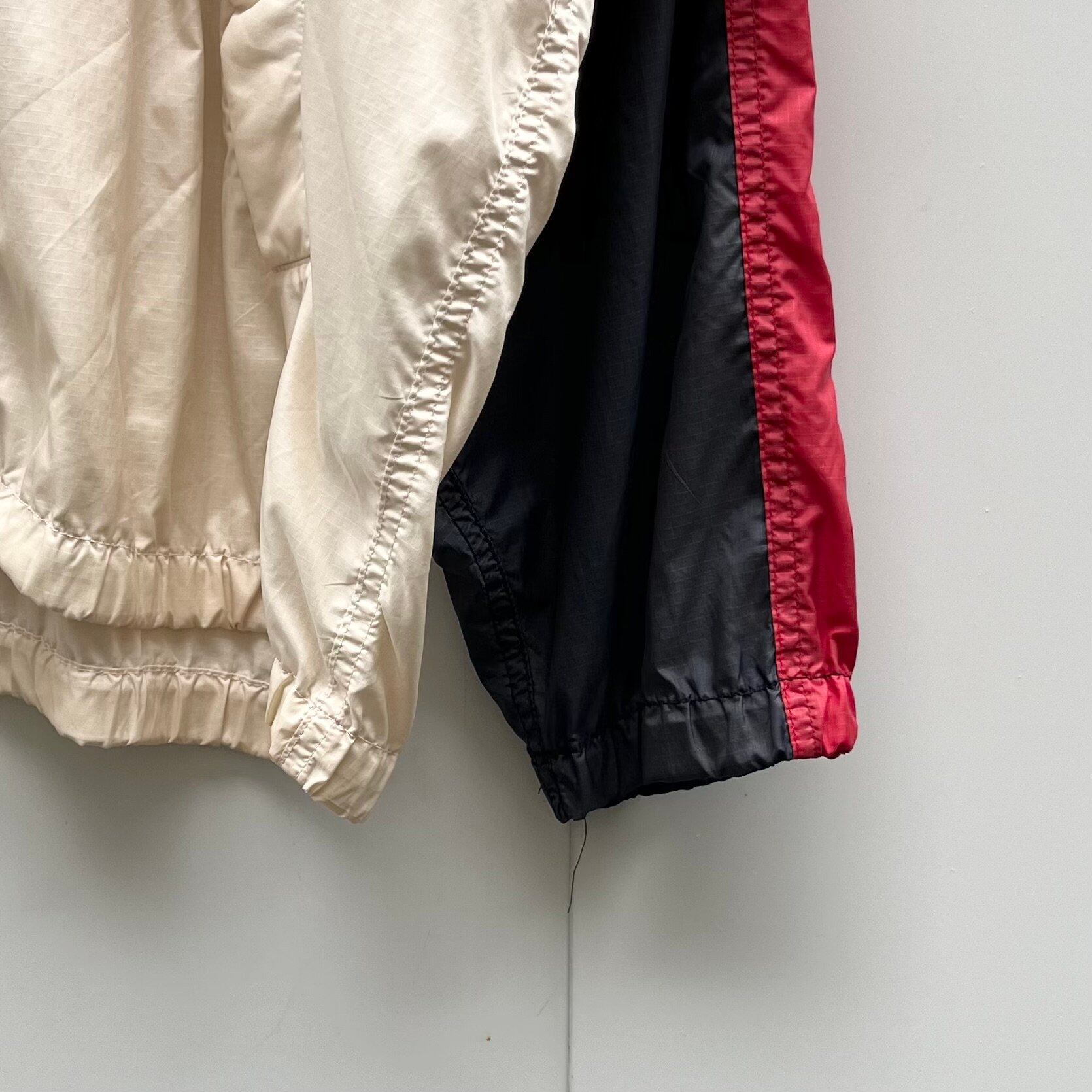 ネイビーxホワイトxレッドのナイロン素材、左胸にロゴ刺繍、バックに大きくプリントと刺繍の合わせロゴ、ロゴ入りスナップボタン、ハンドウォームポケット、フードドローコードが入るデザインです。
