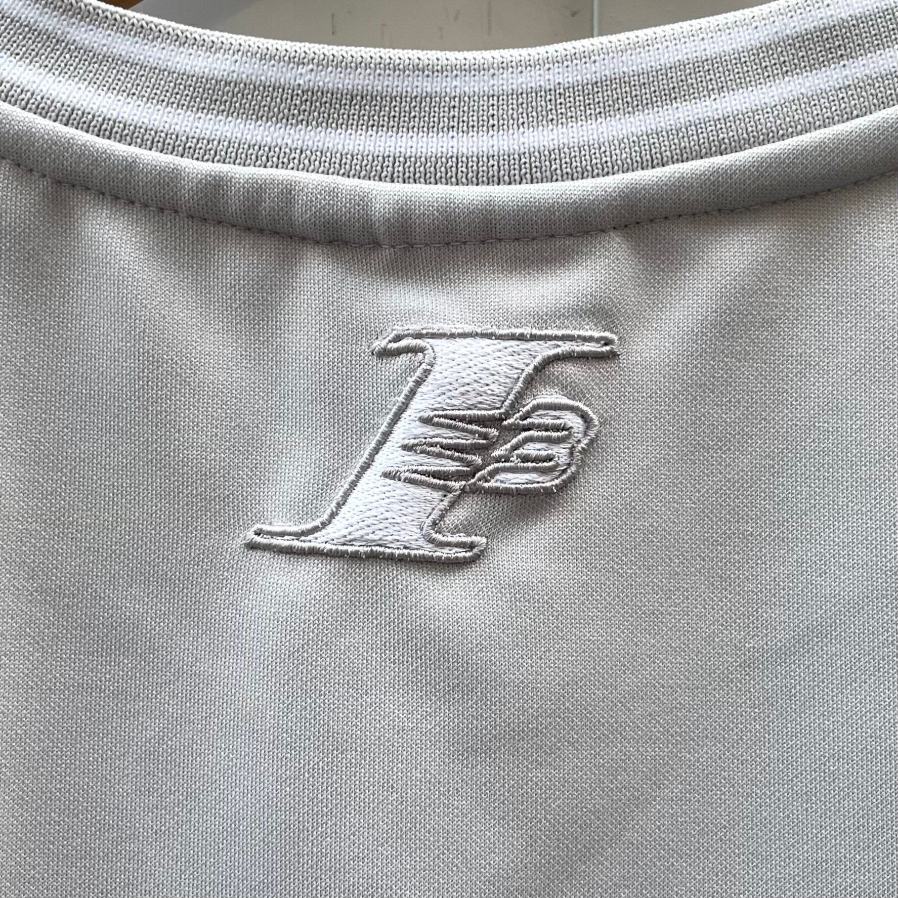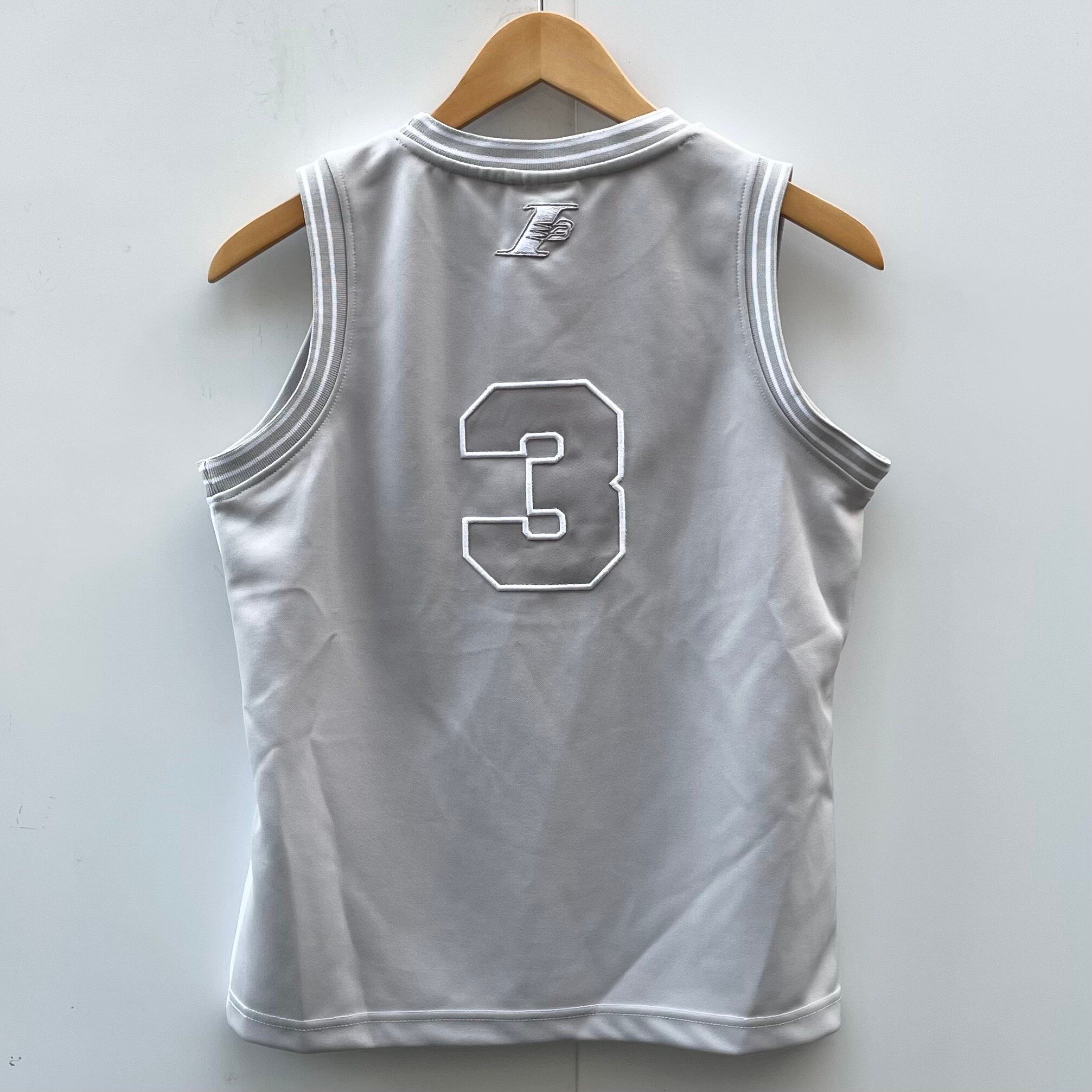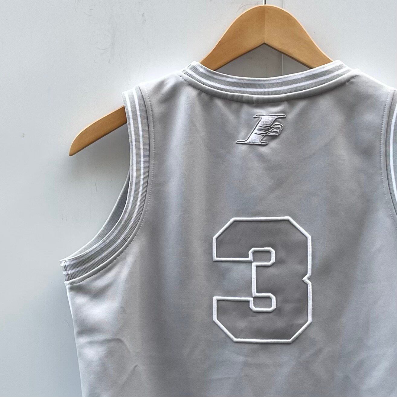 ホワイトxグレーのポリエステル素材、左胸に3ワッペンと切り替え、バックに大きく3ワッペン、襟元にI3ロゴマーク刺繍が入るデザインです。