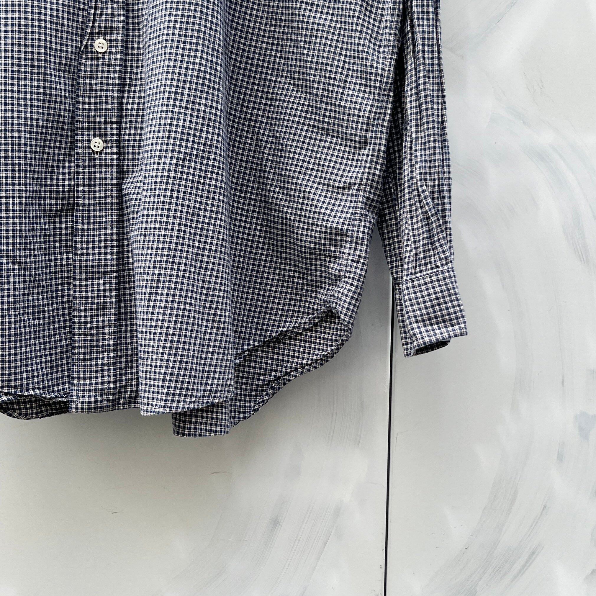 ネイビー系の小柄チェックのコットン素材、左胸にポニー刺繍、ボタンダウンのシンプルデザインです。