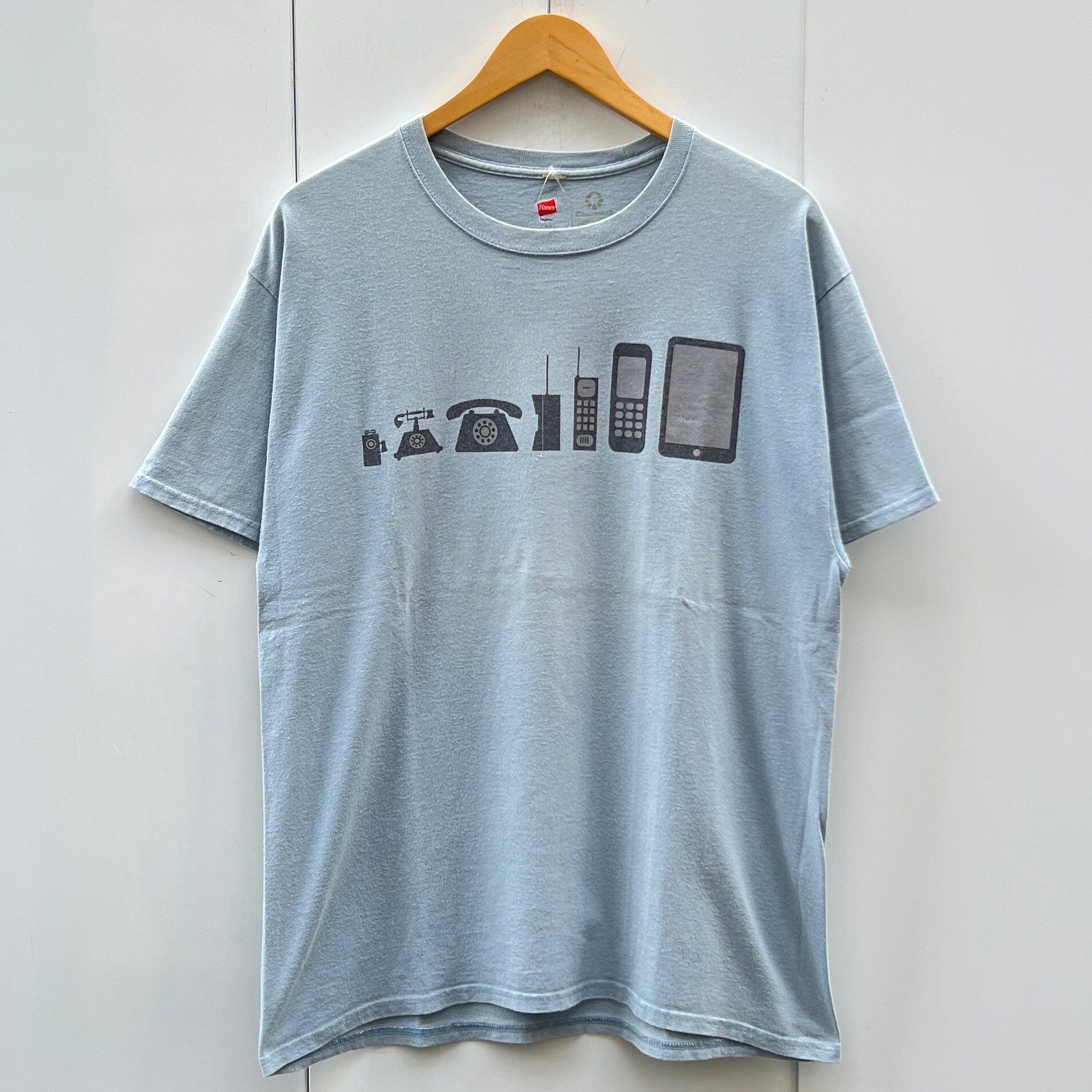 グレーサックスブルーのコットン素材、フロントに電話の進化がプリントされ、バックにメッセージがプリントされたデザインです。
