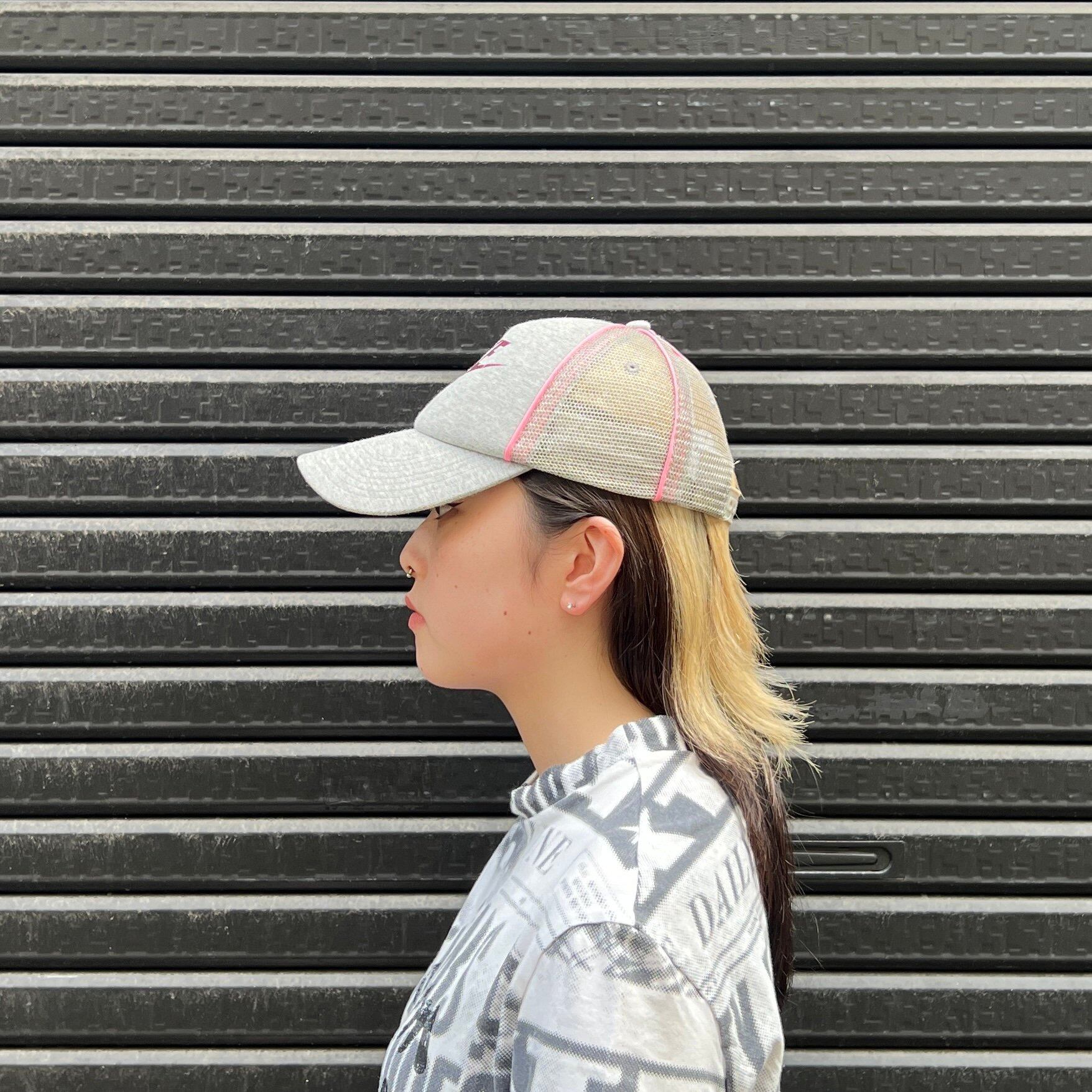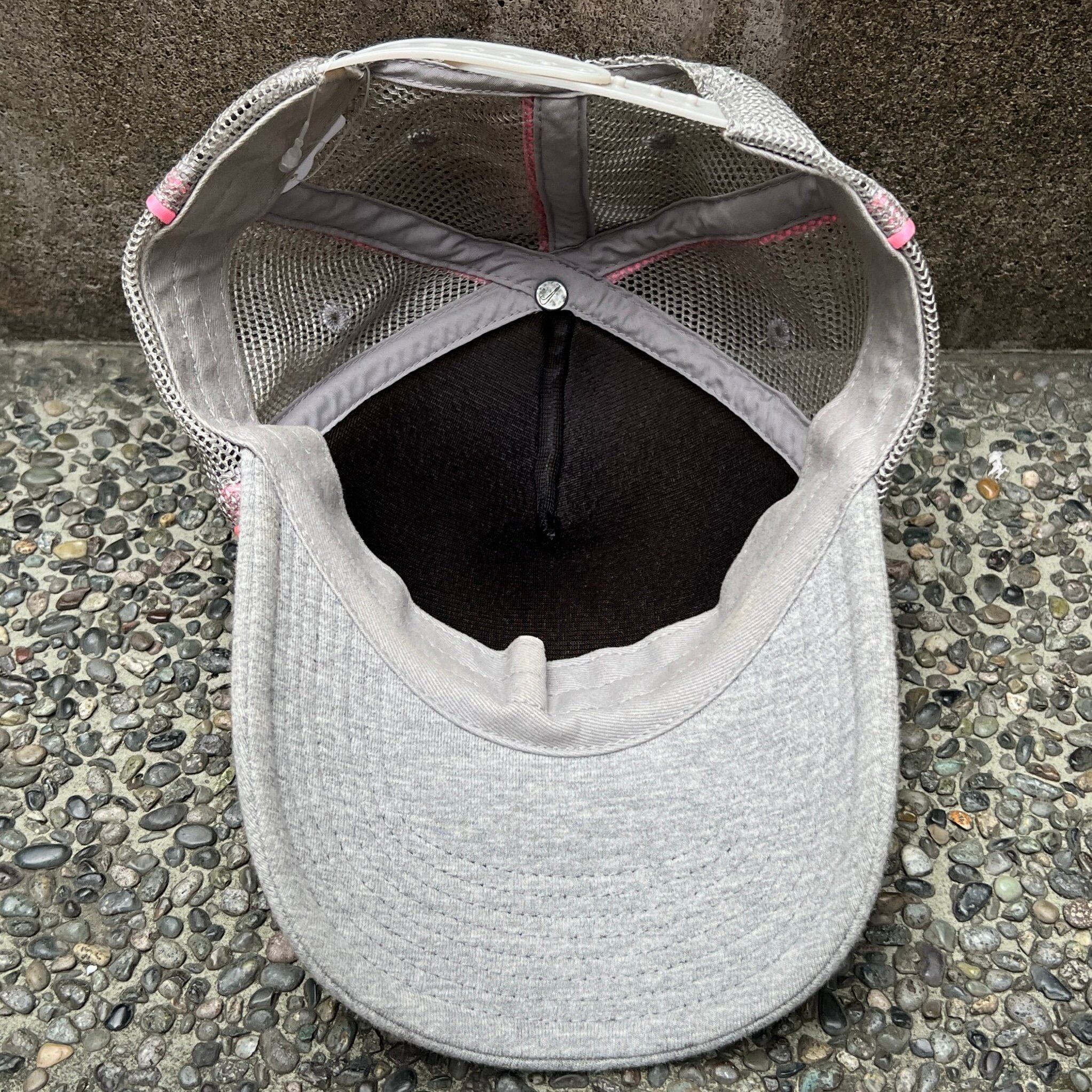 グレーのメッシュ素材xピンクパイピング、フロントにNIKEロゴプリント、スナップバックアジャスターを使用したデザインです。
