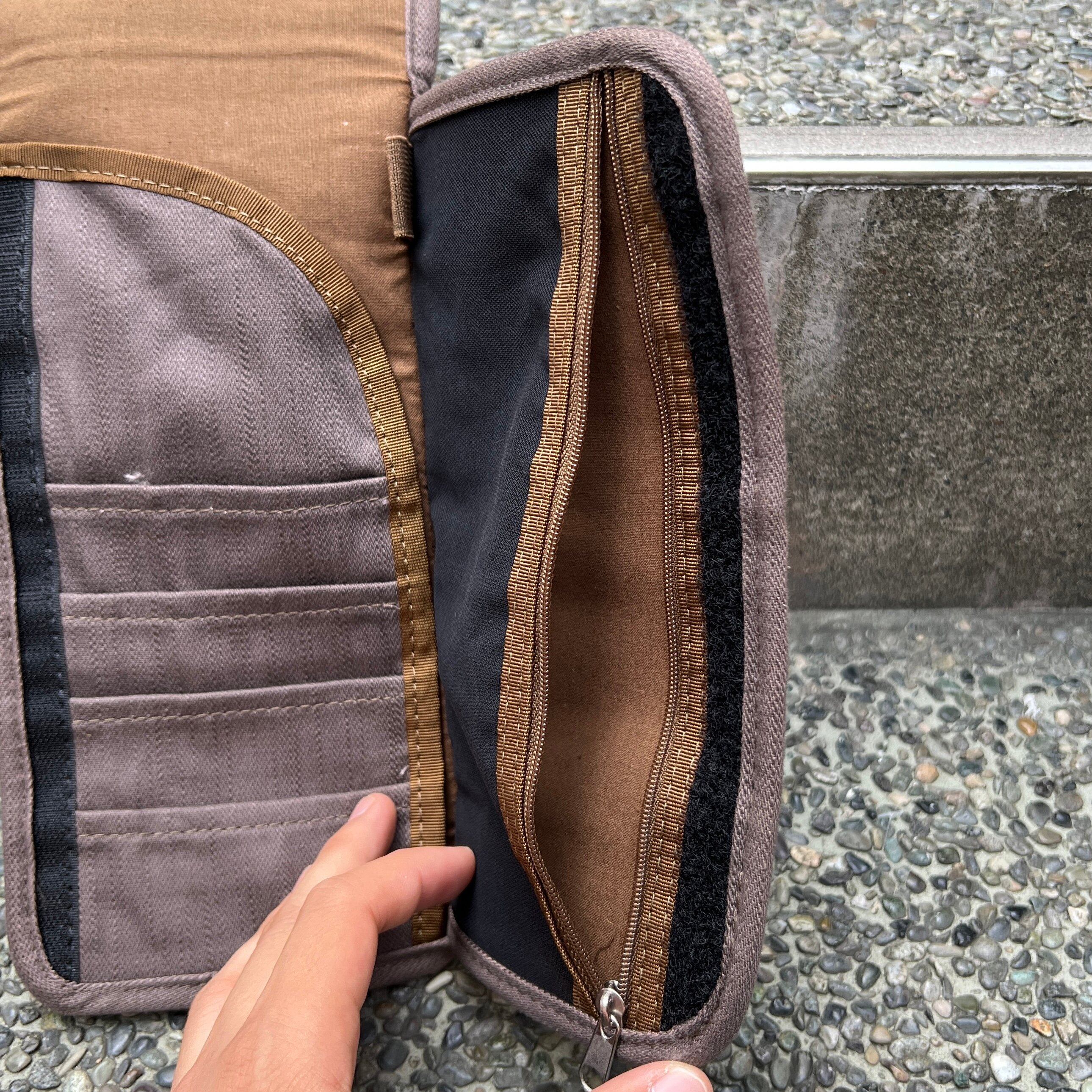 モカブラウンのコットン素材、フロントにフェイクレザーのロゴネーム、ベロクロで開閉、ジッパー付きポケット、カードケース、ペン差しが付いたデザインです。