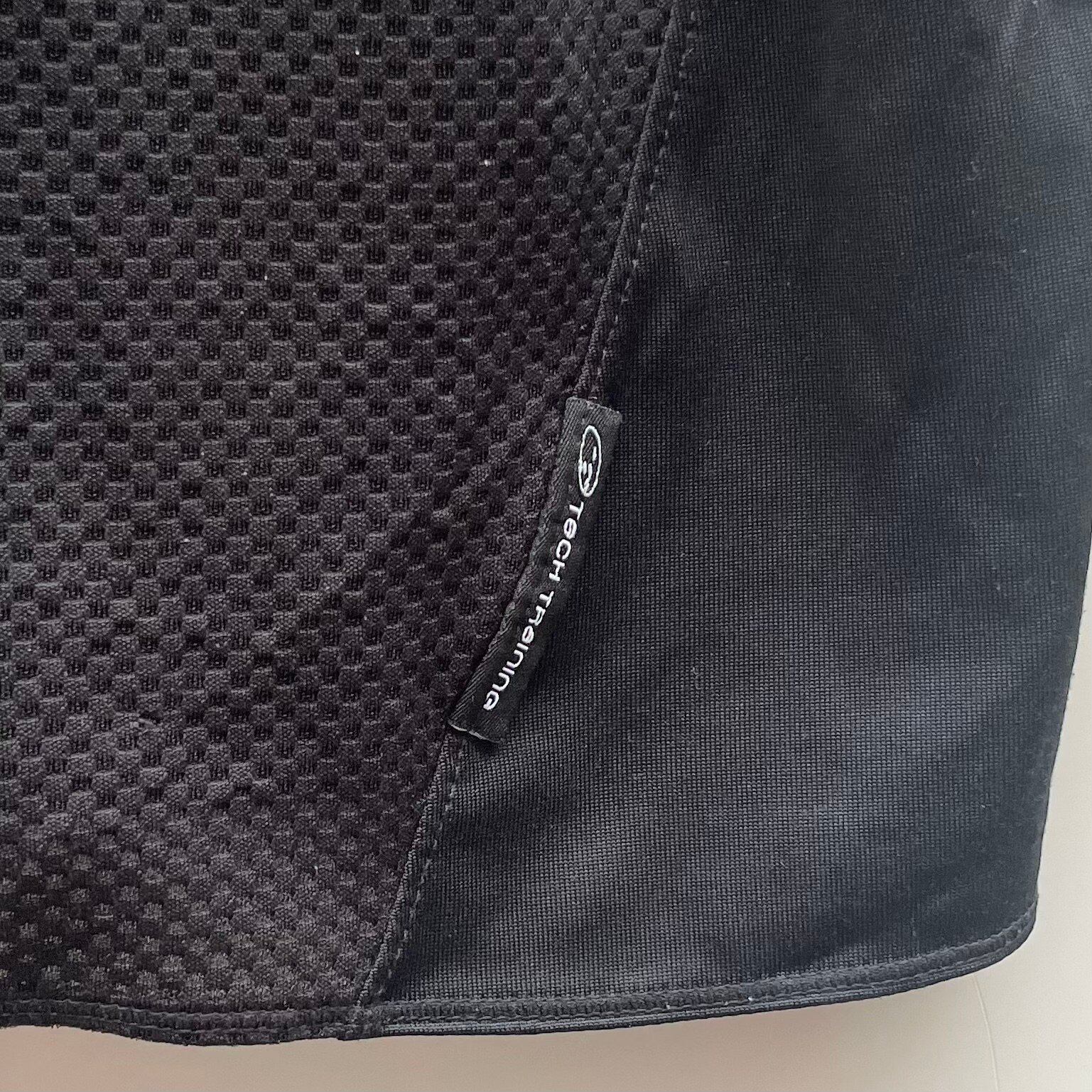 ブラックx小トライアングル柄xブラックメッシュのポリエステル素材、左袖にスウォッシュ刺繍、テックトレーニング素材を使用したデザインです。