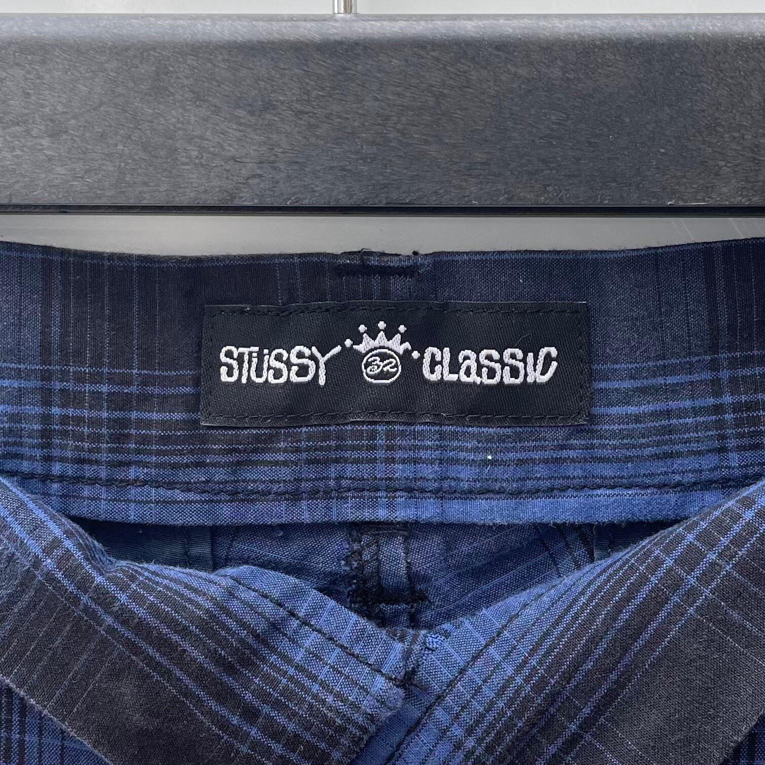 ブルーxネイビー系のチェック柄、右バックポケットにSTUSSY CLASSICのロゴジッパー、4ポケットのスラックス型デザインです。