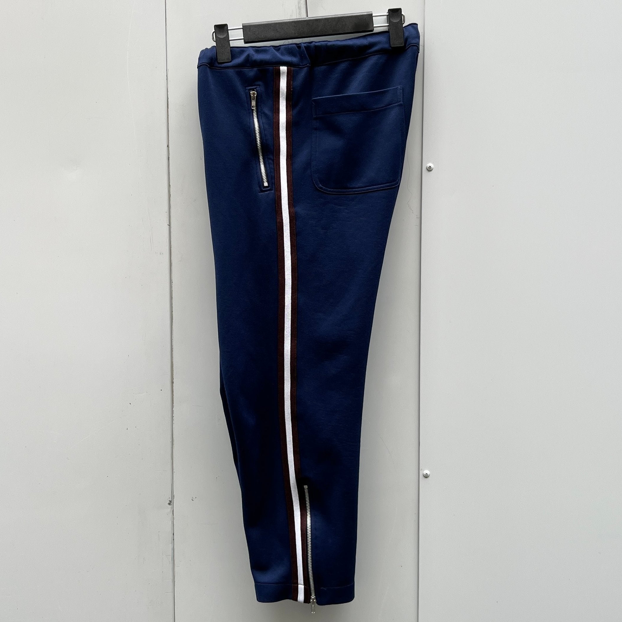 ネイビーのジャージ素材xブラウン/ホワイトライン、ジッパー付きハンドウォームポケット、裾がジッパーで開閉するデザインです。