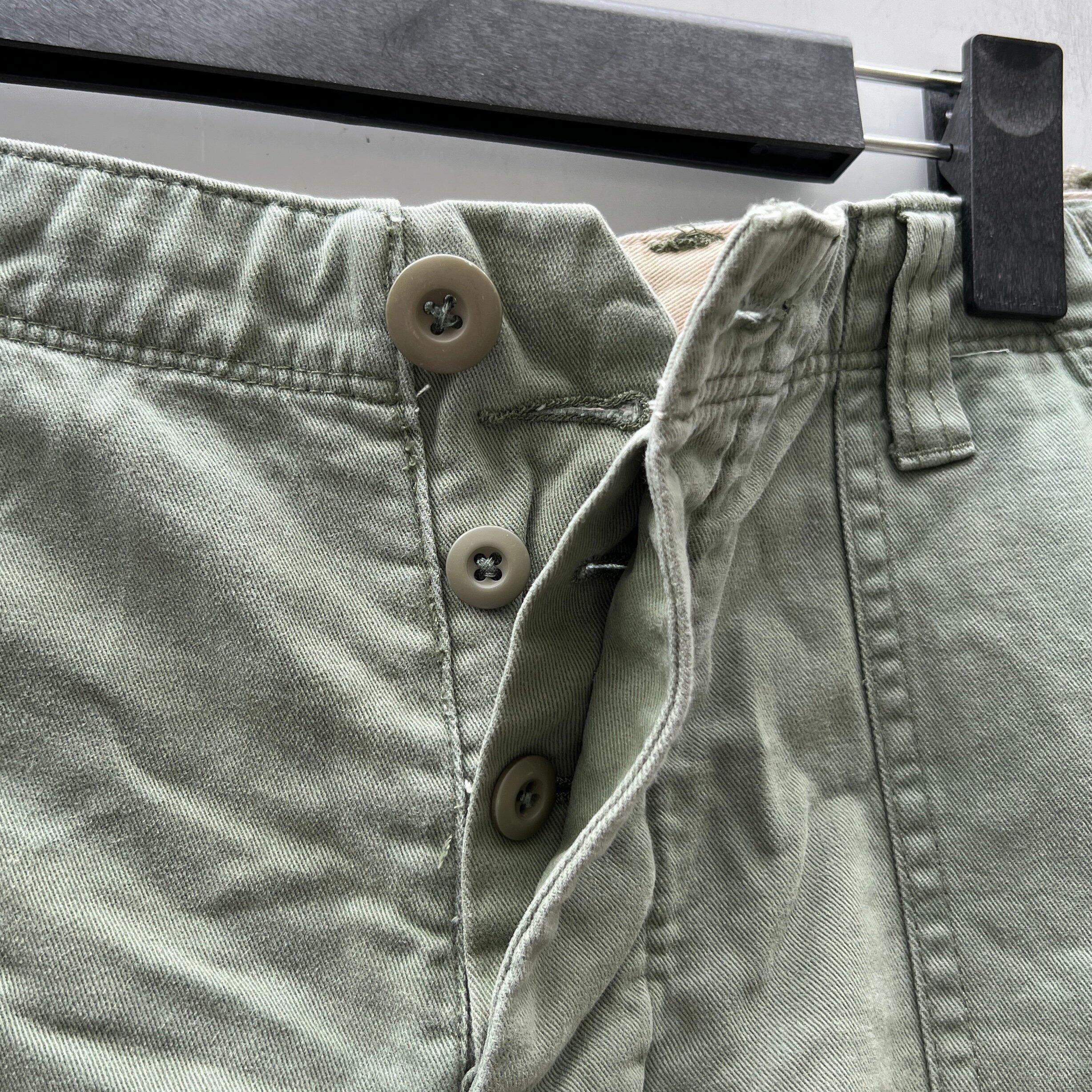 ライトオリーブグリーンのコットン素材、右バックポケット上にネーム、ウエストの両サイドにアジャスターの付いたデザインです。