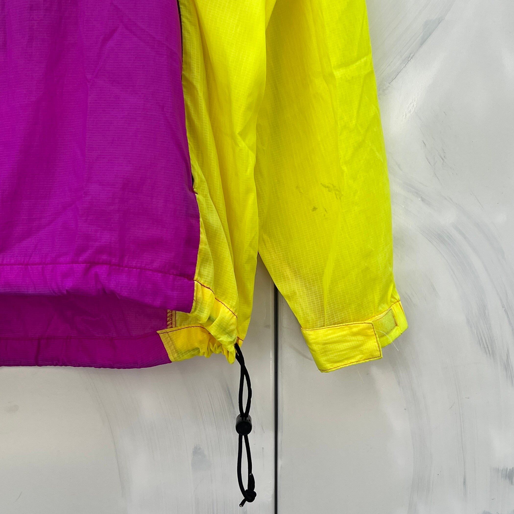 ダークピンクxイエローxエメラルドグリーン、左胸にロゴ刺繍、裾にドローコード、胸のポケットに全て収納して持ち運べるデザインです。