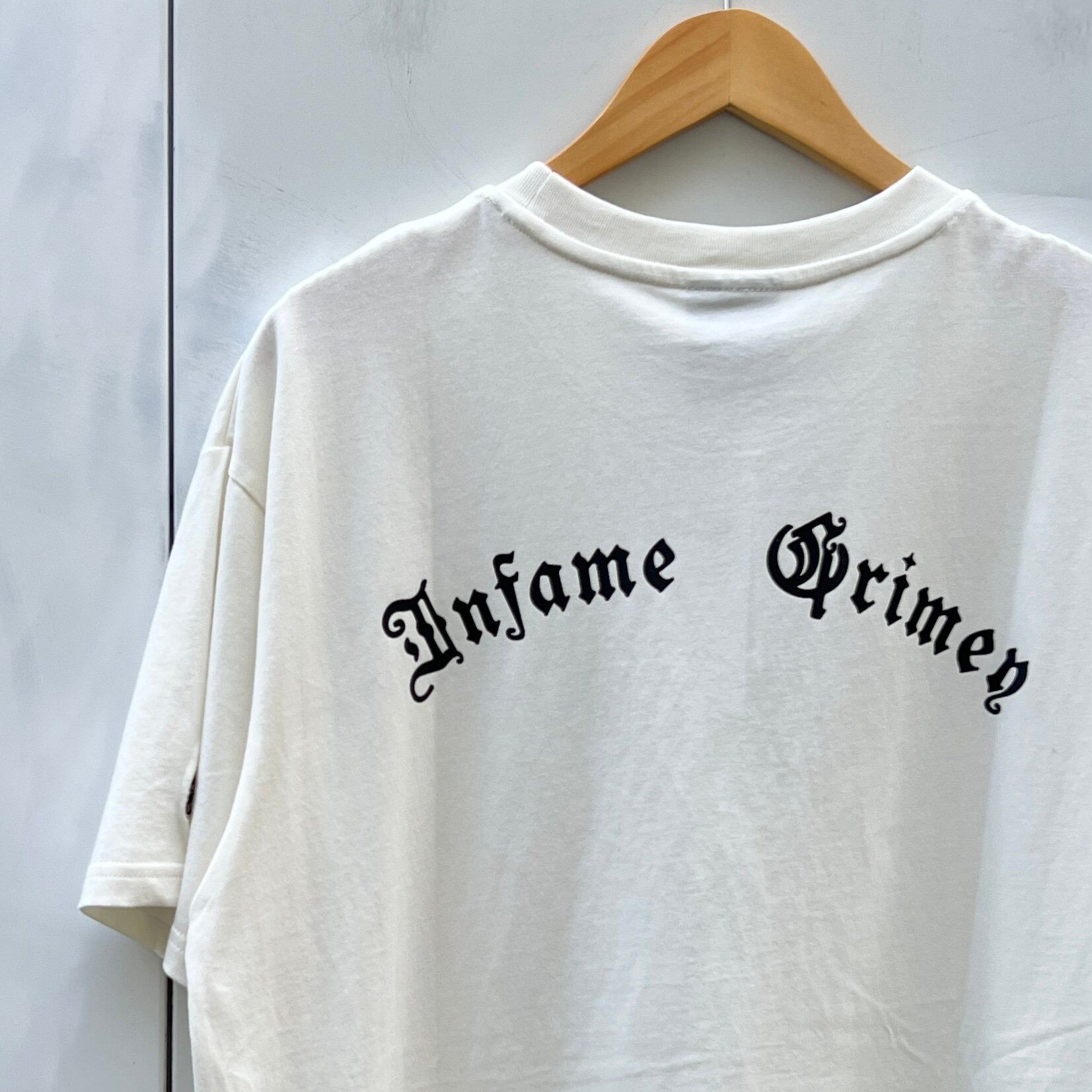 ホワイトのコットンボディ、フロントにフォトプリント、左袖にスカル刺繍、バックにInfame Grimeyが入るデザインです。