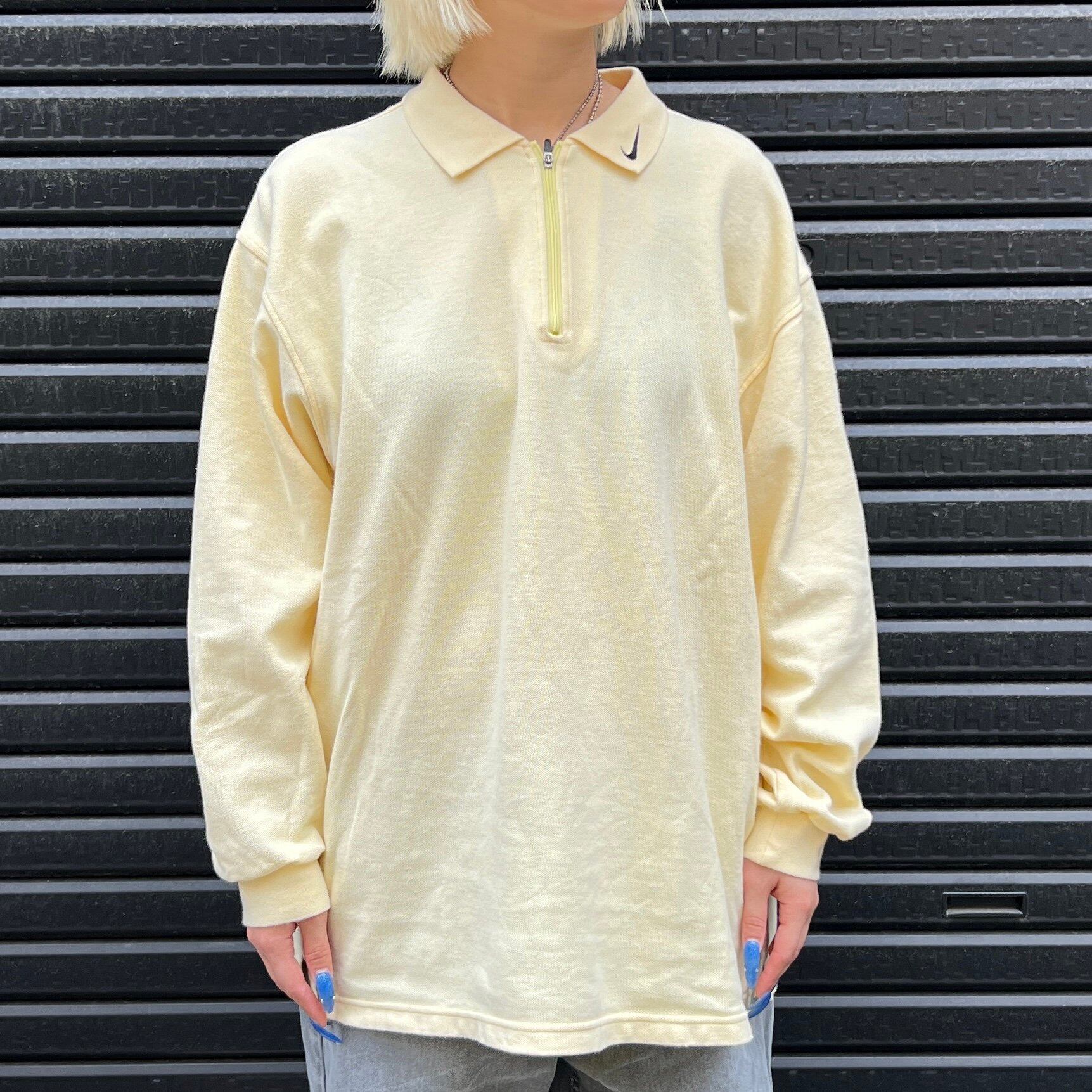 イエローのコットン鹿の子素材、襟にスウォッシュ刺繍、ハーフジップのデザインです。