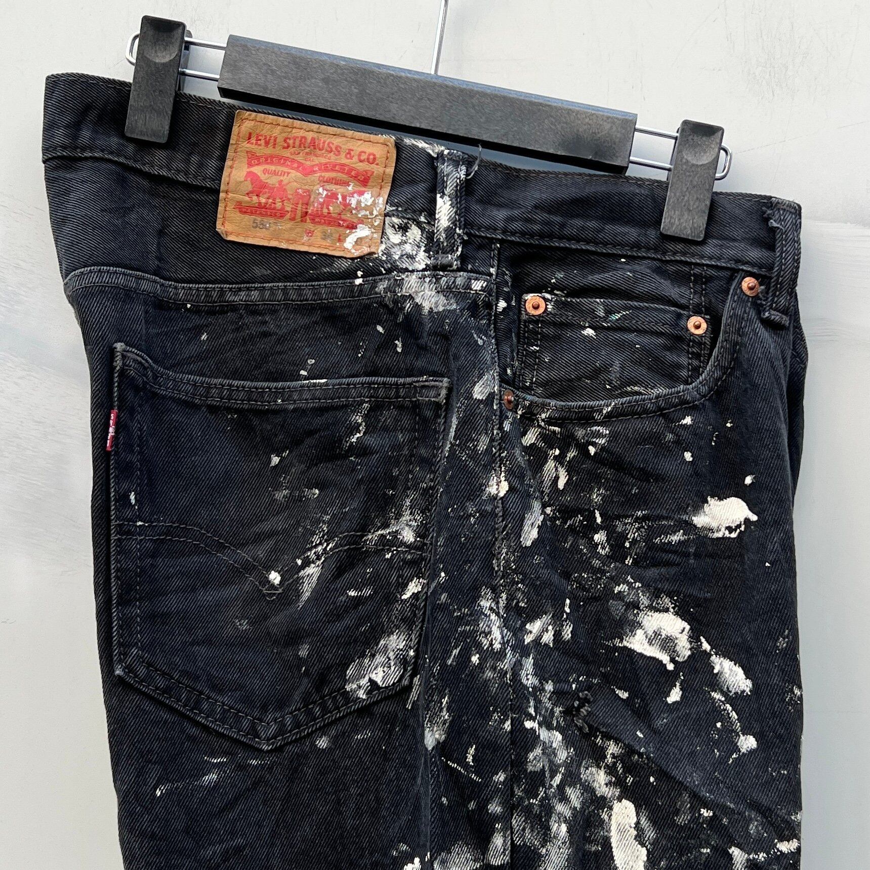 後染めのウォッシュのかかったブラックデニム、全体にペンキ、5ポケット型の定番デザインです。