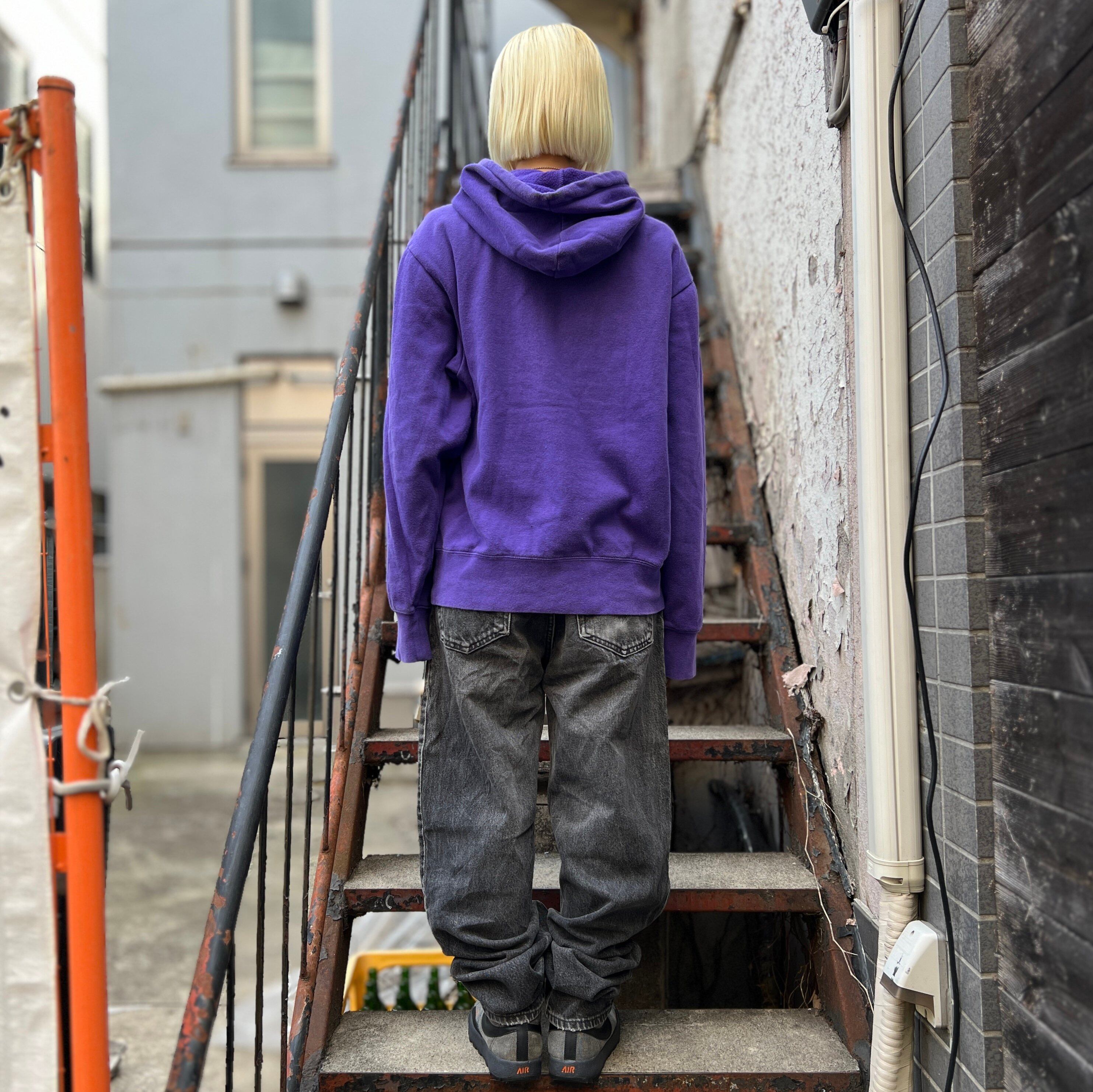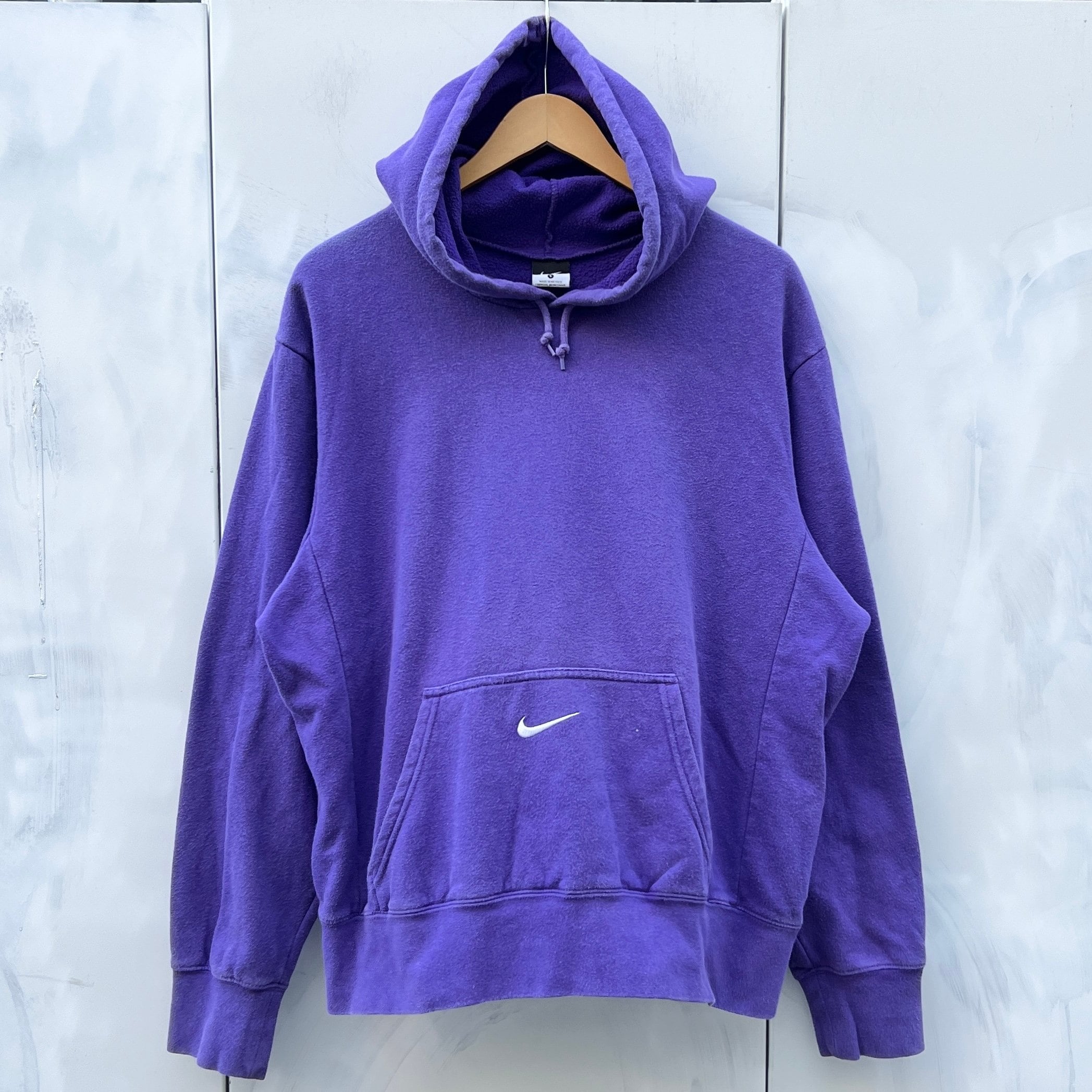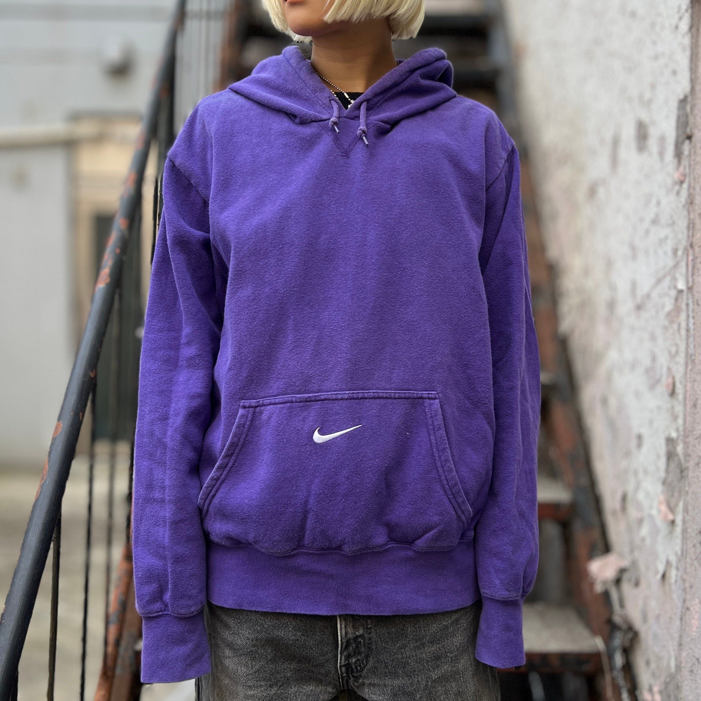 パープルの裏起毛ボディ、フロントカンガルーポケットのセンターにスウォッシュ刺繍が入るデザインです。