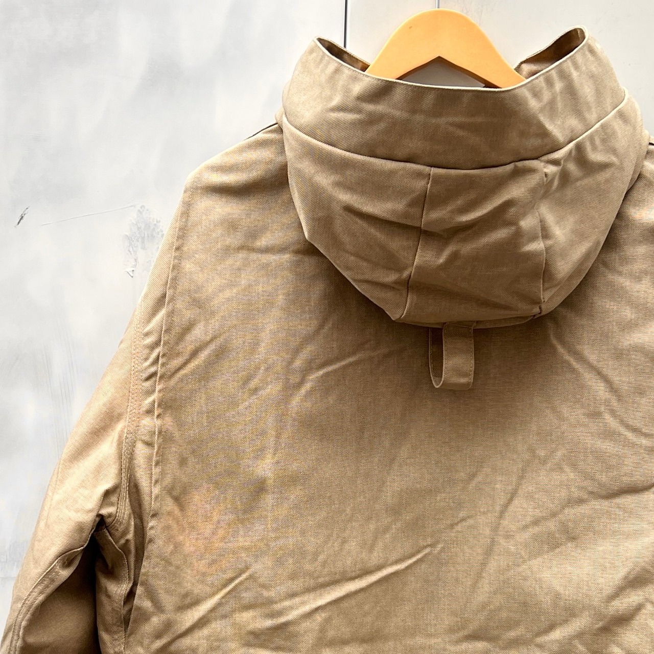 ベージュのナイロン系素材、左胸のポケットにロゴ刺繍、フラップ付きポケットとハンドウォームポケット、中綿のキルト裏地が付いたデザインです。