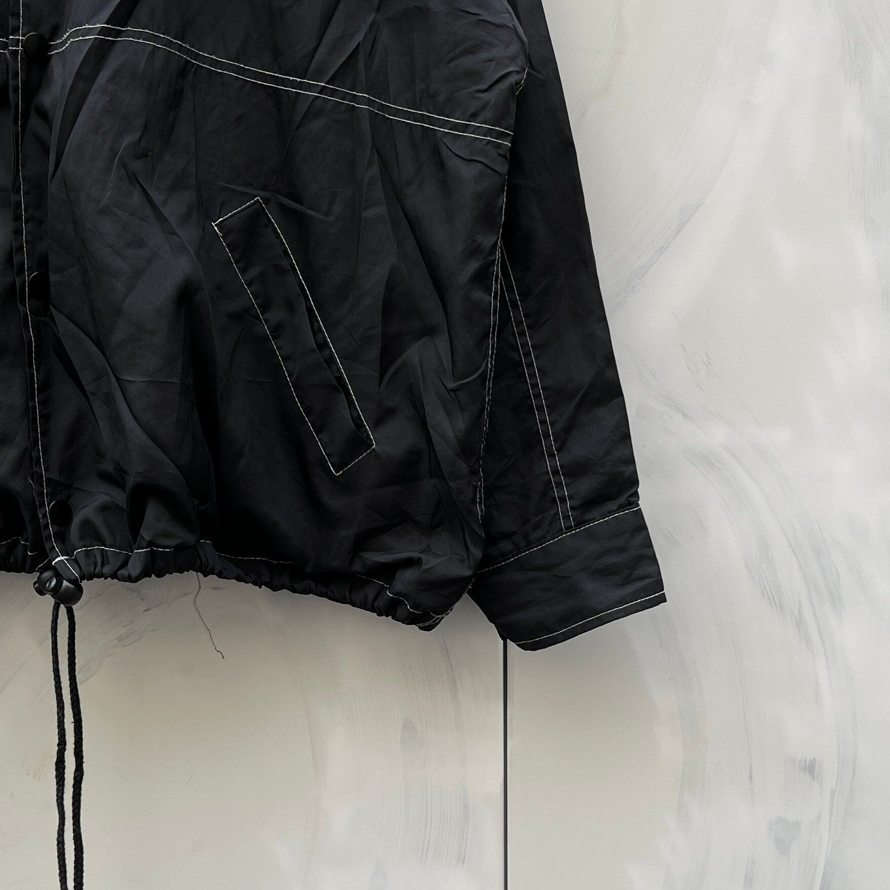 ブラックのナイロン素材、左胸にロゴとロゴマーク刺繍、バックに大きくロゴ刺繍、裾にドローコードが入るデザインです。