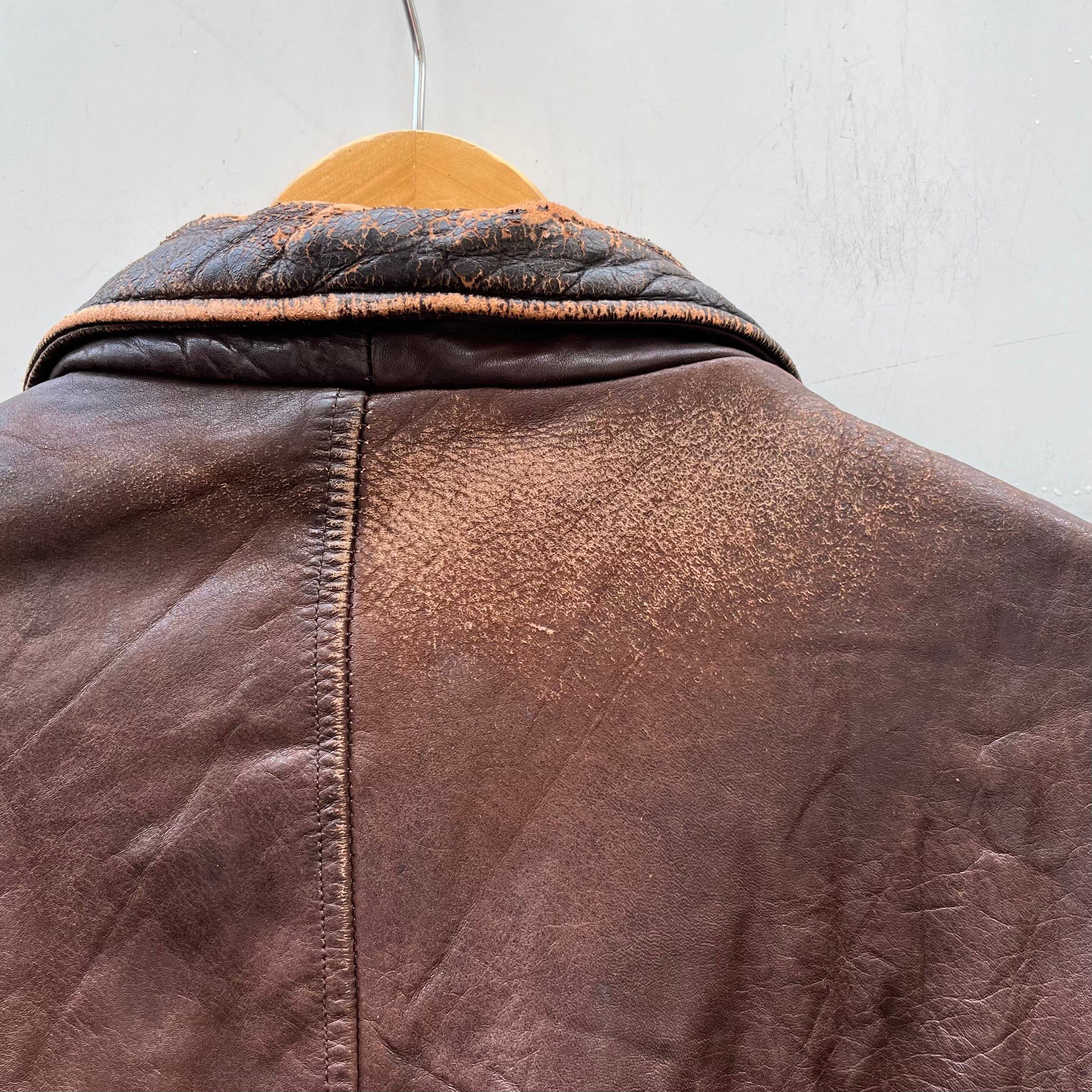 ブラウンレザー、フラップポケットとハンドウォームポケット、肩にエポレット、ボンバージャケット型のデザインです。