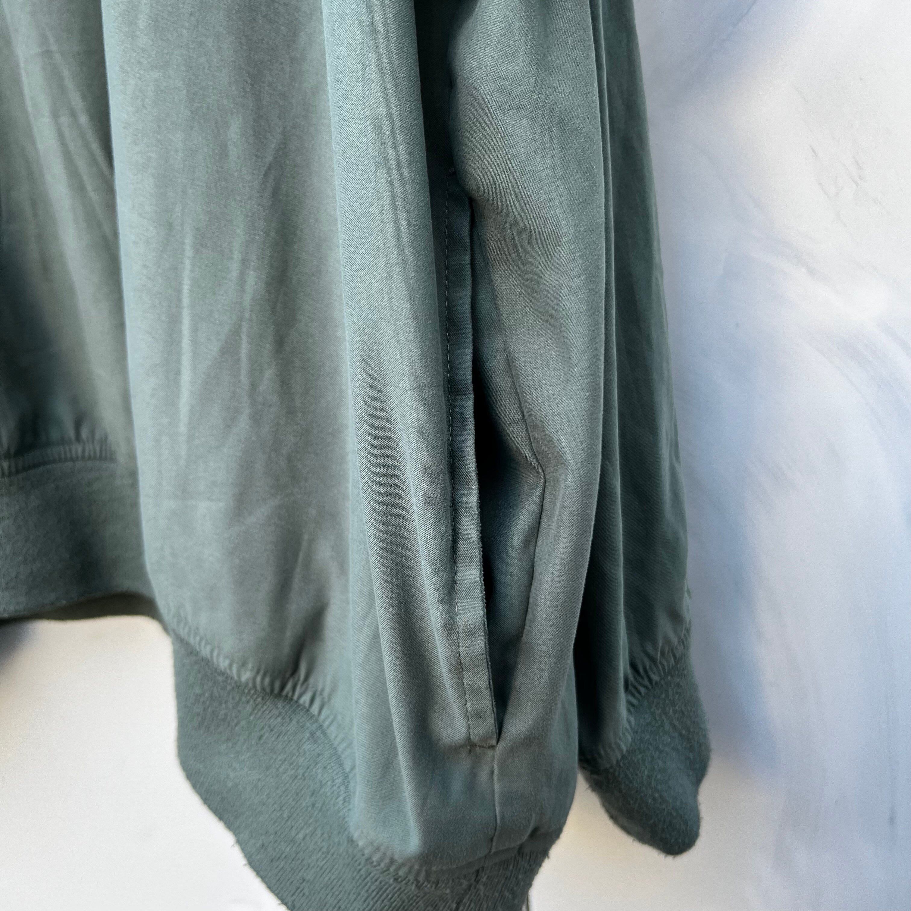 オリーブグリーンのポリエステル素材、左胸にロゴ刺繍、両サイドにポケットが付いたシンプルデザインです。