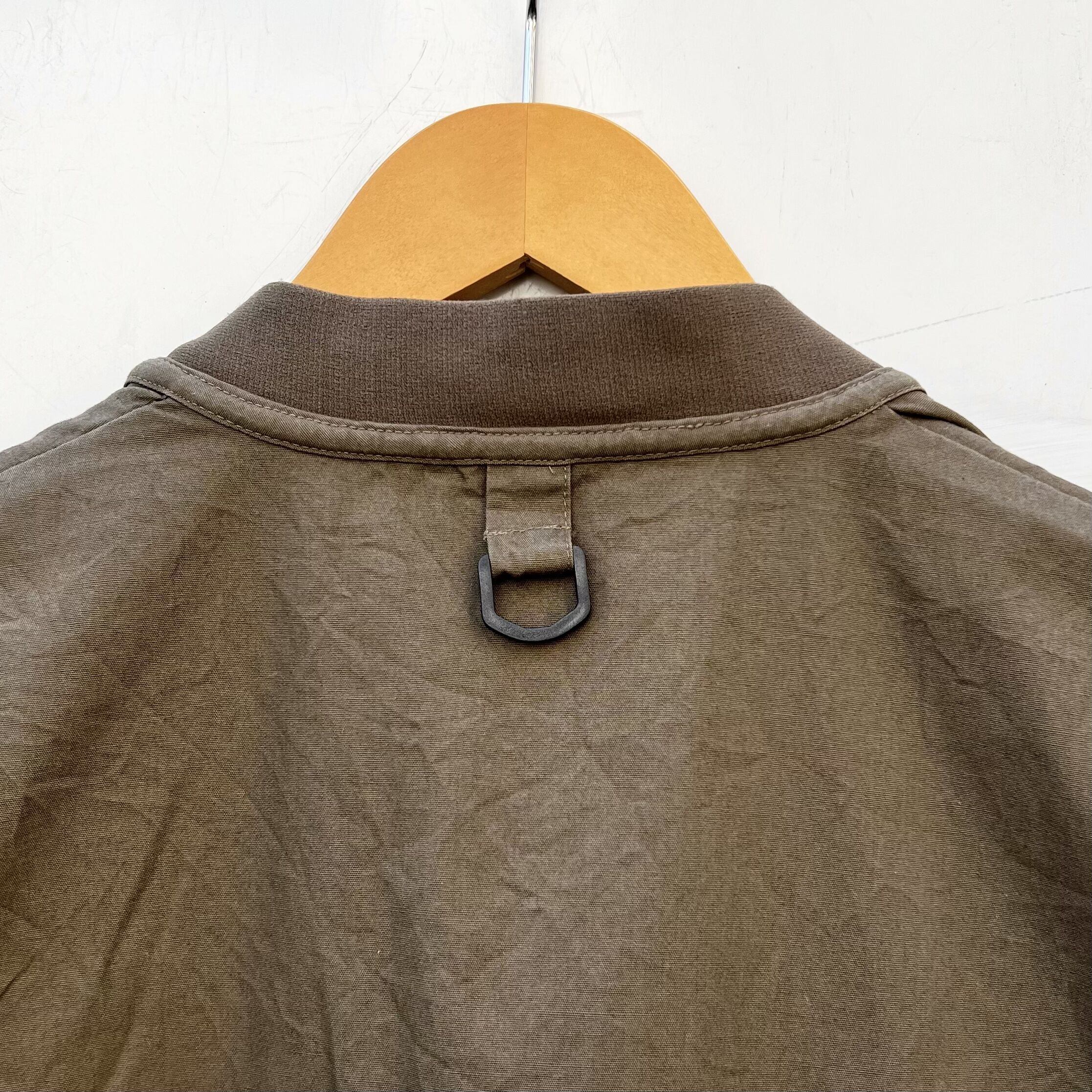 オリーブグリーンのポリエステル混素材、左胸のフラップポケットにロゴ刺繍、シープファー、フロントに計9個のポケット、バックに大きなポケットが付く本格的なアウトドア仕様のデザインです。