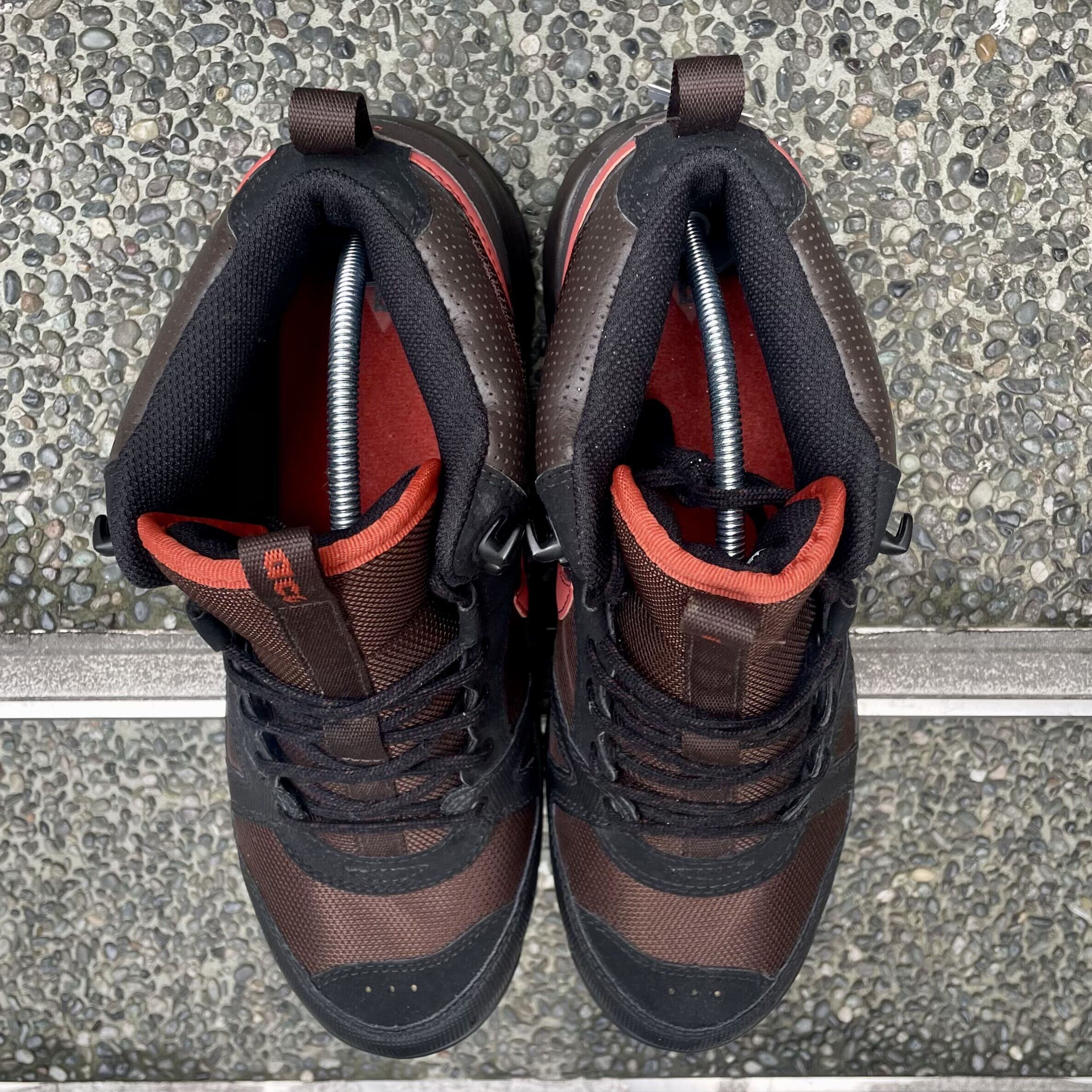 ブラウンxブラックxオレンジ、ゴアテックスの素材を使用したハイカットのデザインです。