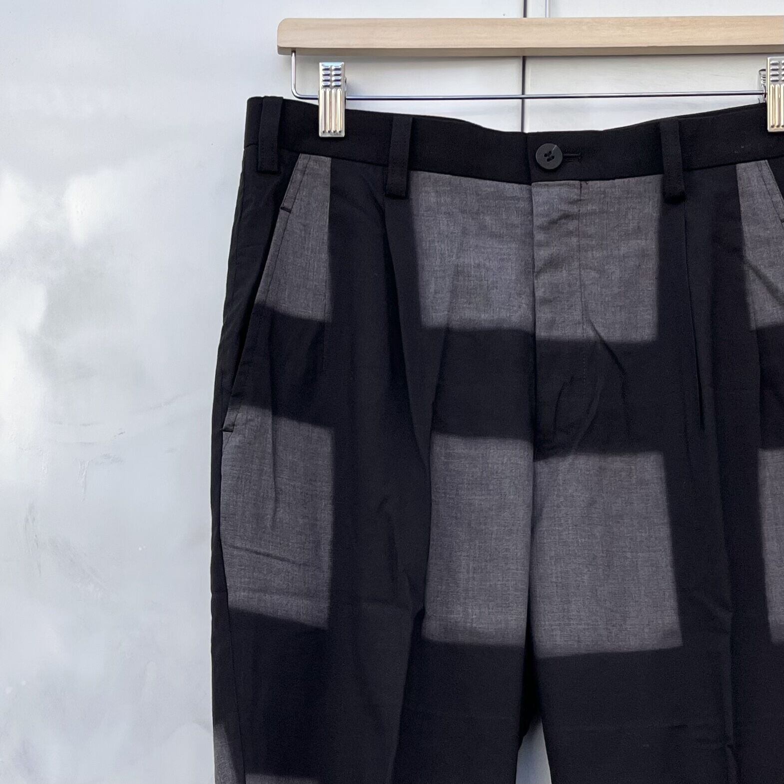 ブラックxグレーのランダムチェックのウール素材、2タック、4つのポケットが付いたスラックス型デザインです。