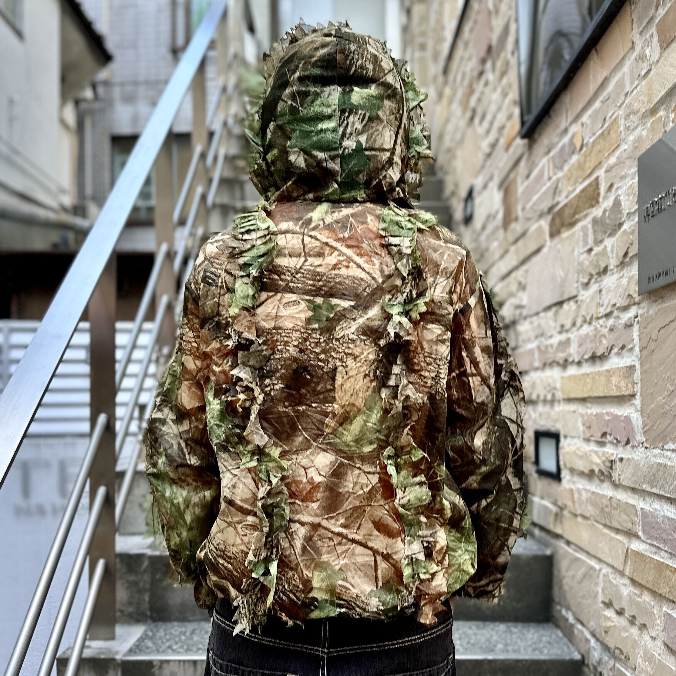 リアルツリーカモのメッシュポリエステル素材、両裾にパッチポケット、裾にドローコード、全体にカモフラージュの装飾、フードにフェイスカバー、が付いた本格デザインです。