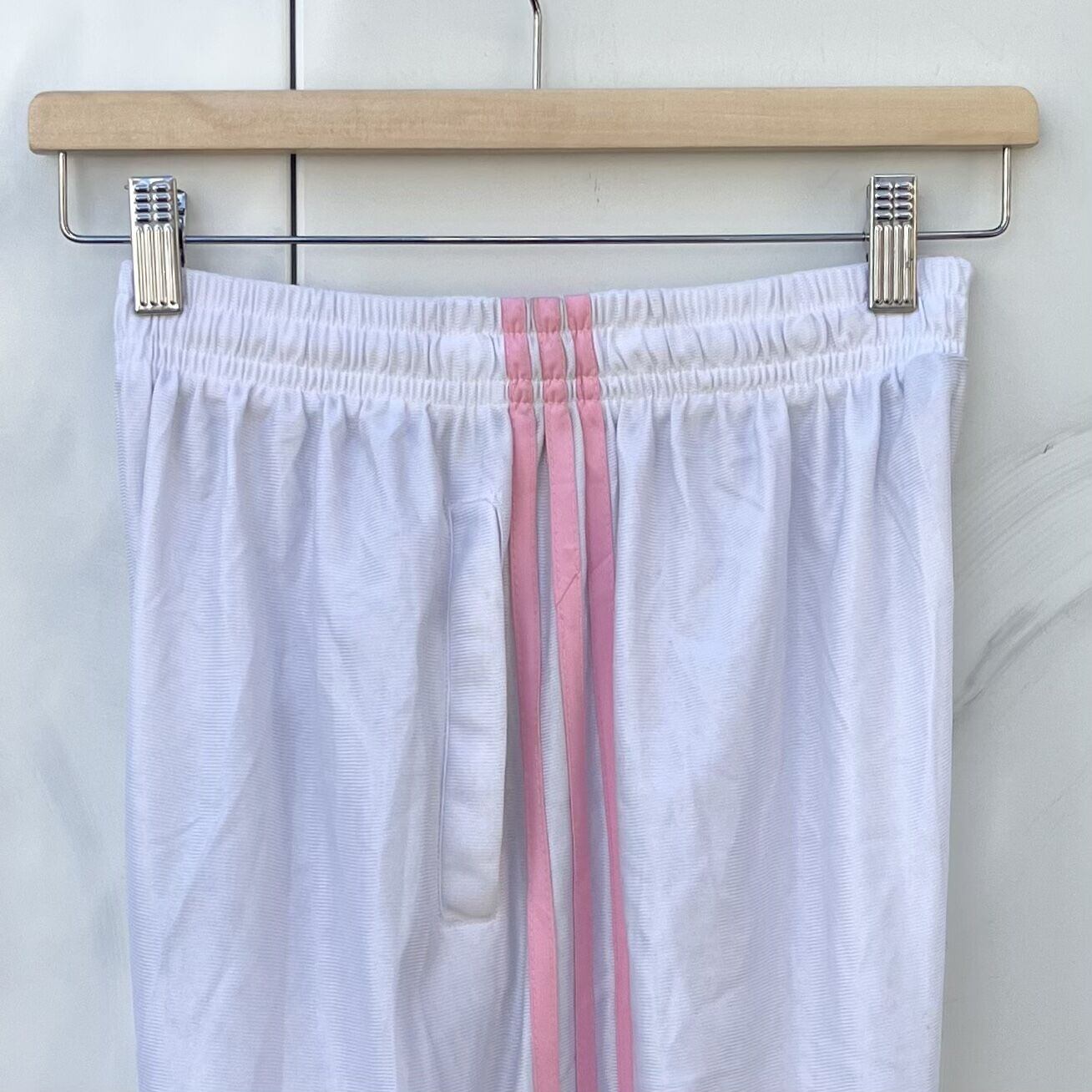 ホワイトxピンク3ストライプスのジャージ素材、左足にロゴが刺繍されたスタンダードデザインです。