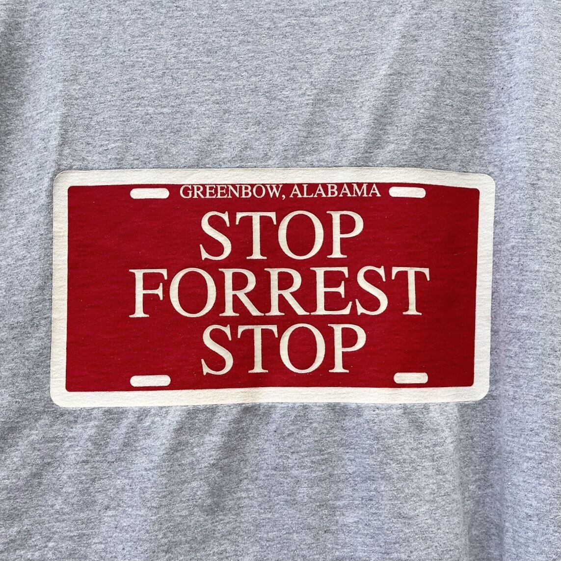 ・バックにSTOP FORREST STOPのナンバープレートプリント