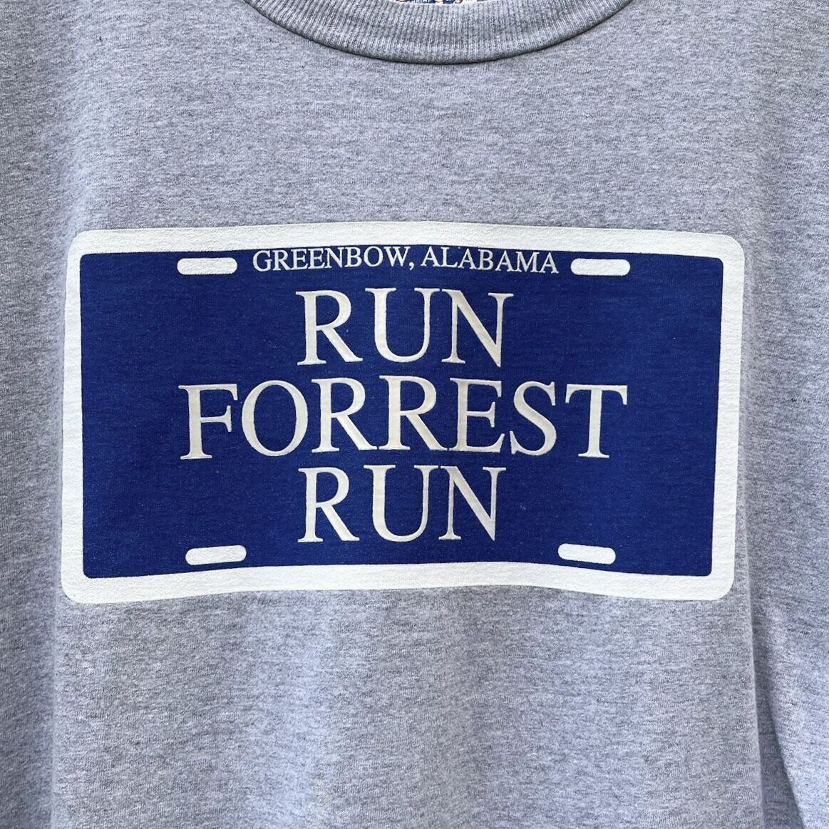 グレーのポリエステル混ボディ、フロントにRUN FORREST RUNのナンバープレートプリント、バックにSTOP FORREST STOPのナンバープレートプリントが入るデザインです。