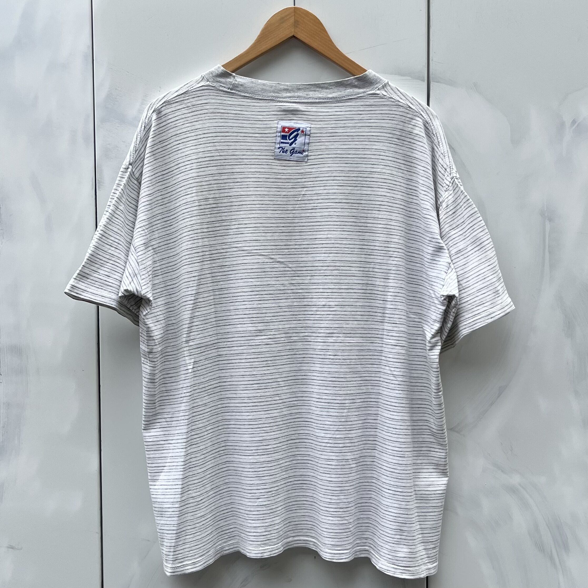 ホワイトxグレーのランダムボーダー、左胸にロゴとロゴマーク刺繍、バック襟元にThe gameロゴネームが付いたシンプルデザインです。