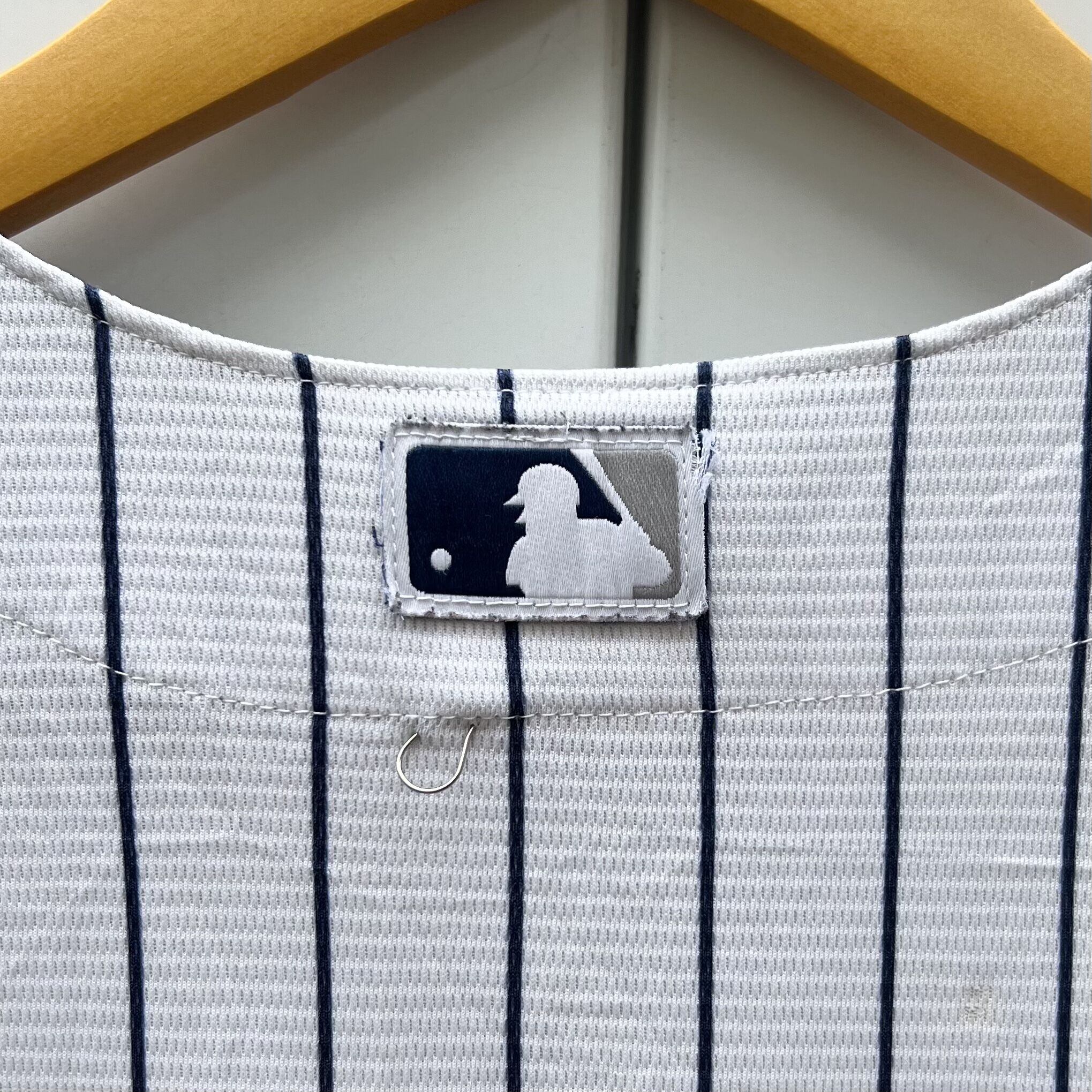 ホワイトxネイビーのピンストライプ、左胸にNYワッペン、バックに24ワッペンの付いたスタンダードデザインです。