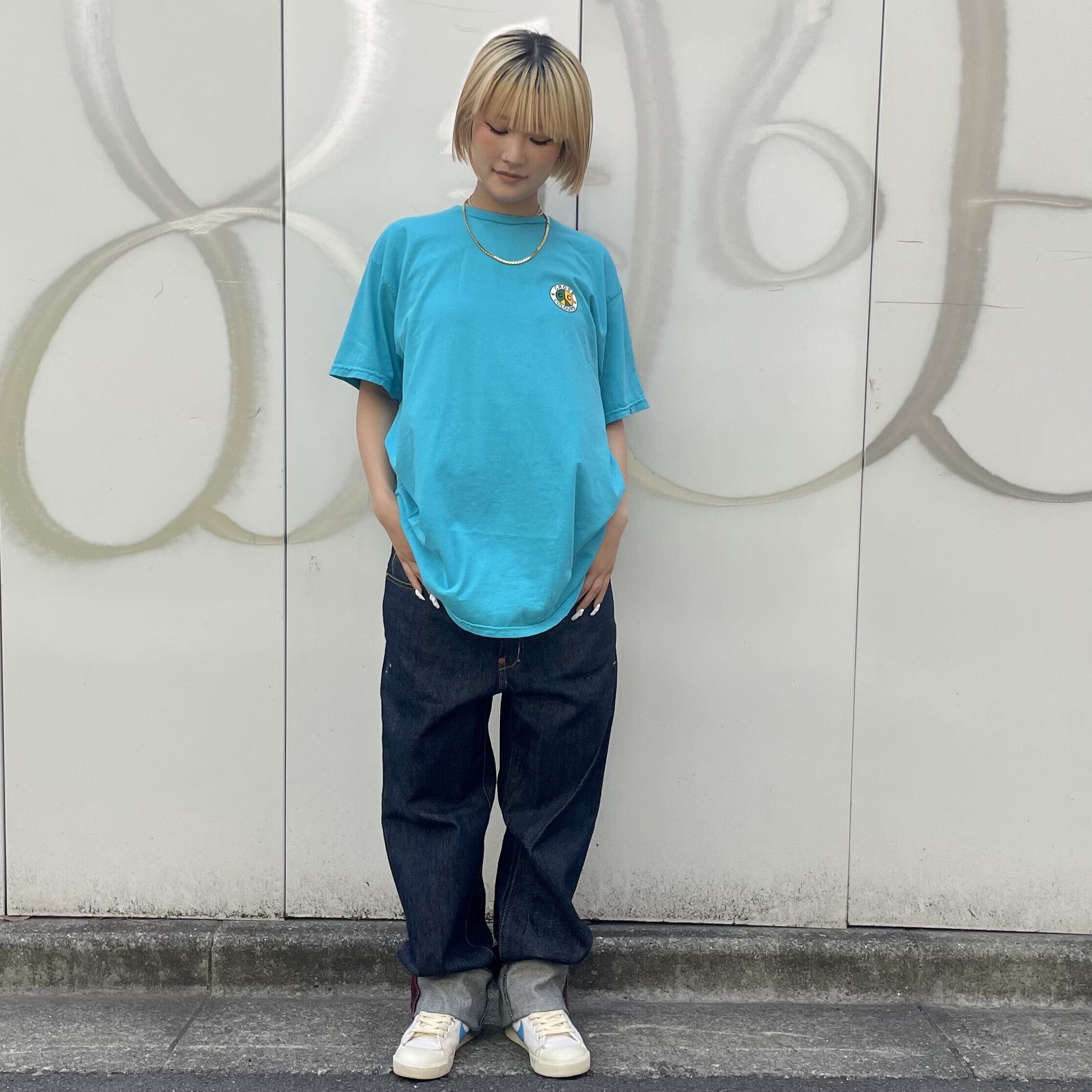 ターコイズブルーのコットン素材、左胸とバックにハートが入った定番のロゴプリント、両袖にはそれぞれFOR THE FUTURE、BY THE CULTUREのメッセージがプリントされたデザインです。