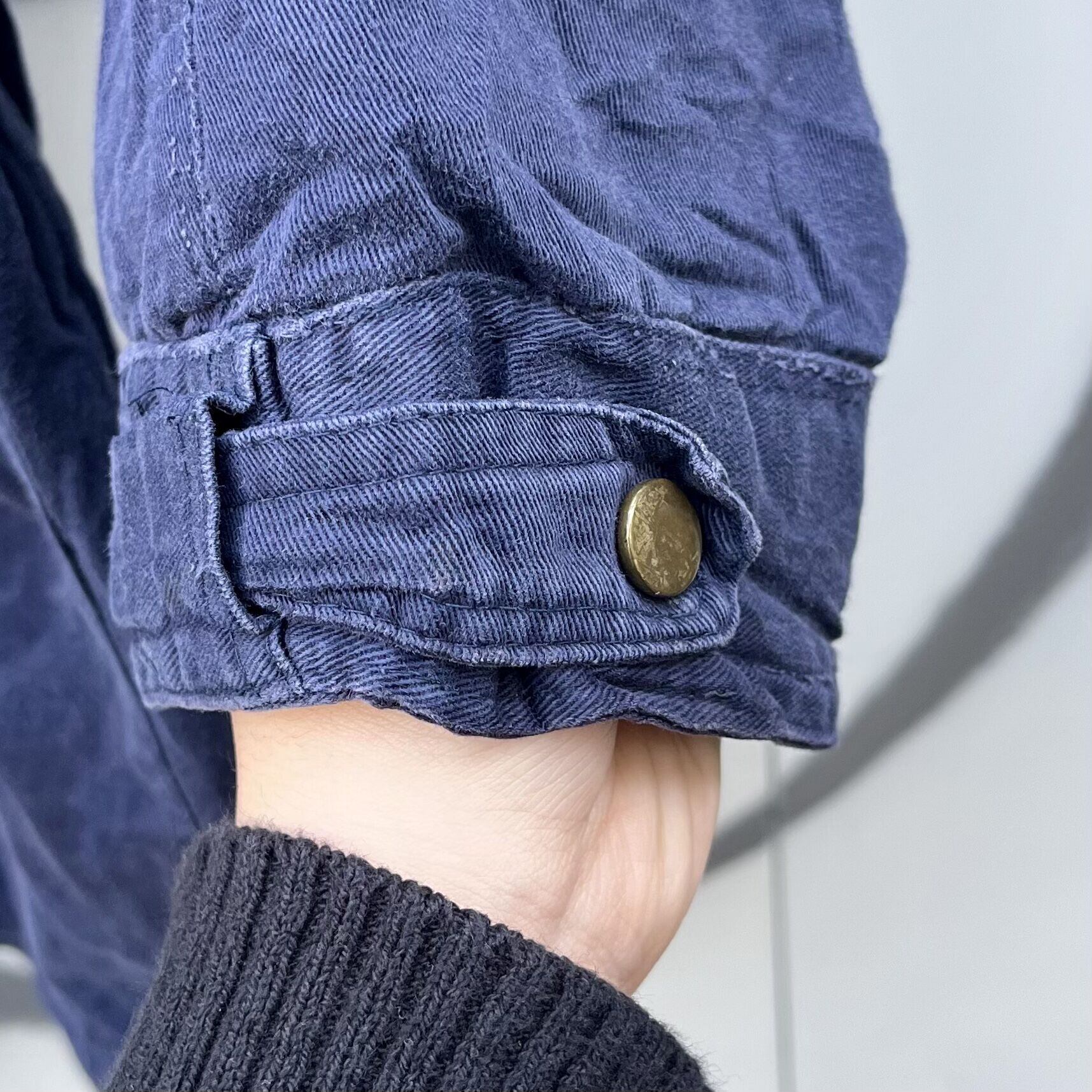 ネイビーのコットン系素材、フードとウエストと裾に紐入り、エポレット、スナップボタンとジッパーで開閉するデザインです。