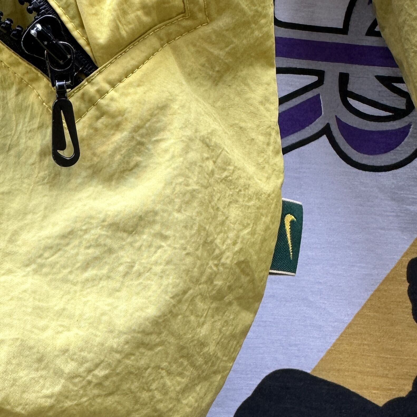 イエローxブラックのナイロン素材、左胸にスウォッシュ刺繍、2重のハンドウォームポケット、フードと裾に紐が入るデザインです。