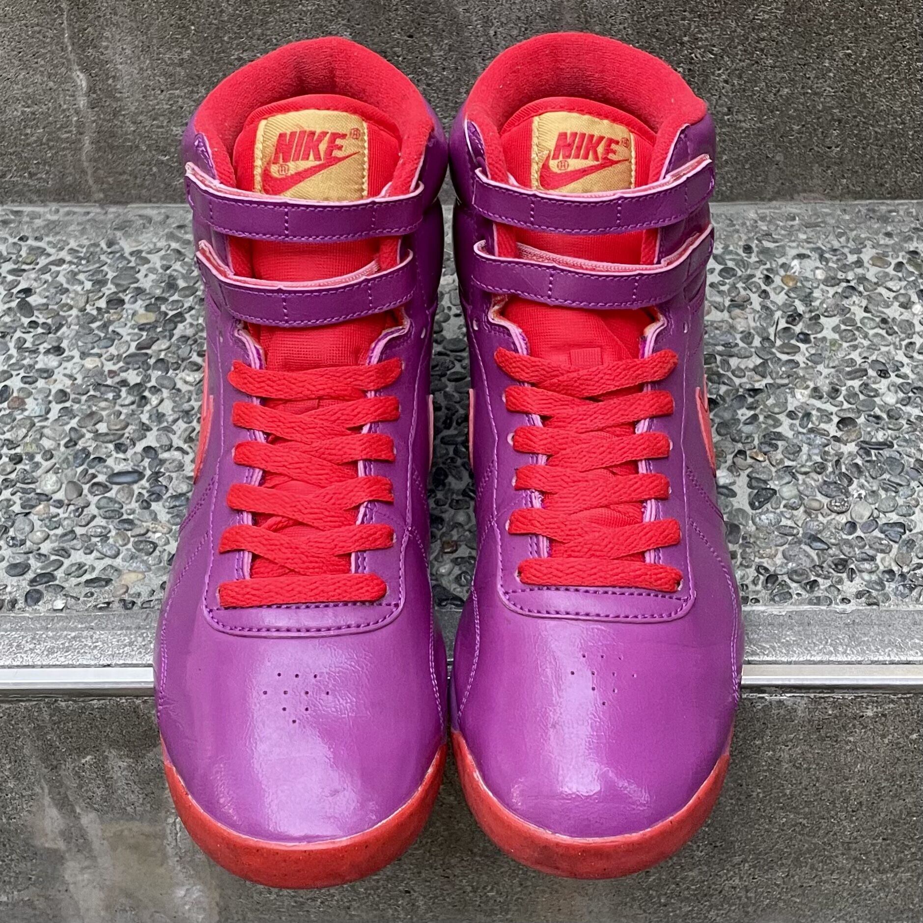 パープルxオレンジのパテント素材、ウィメンズのハイカットモデル、フィットネス用のデザインです。