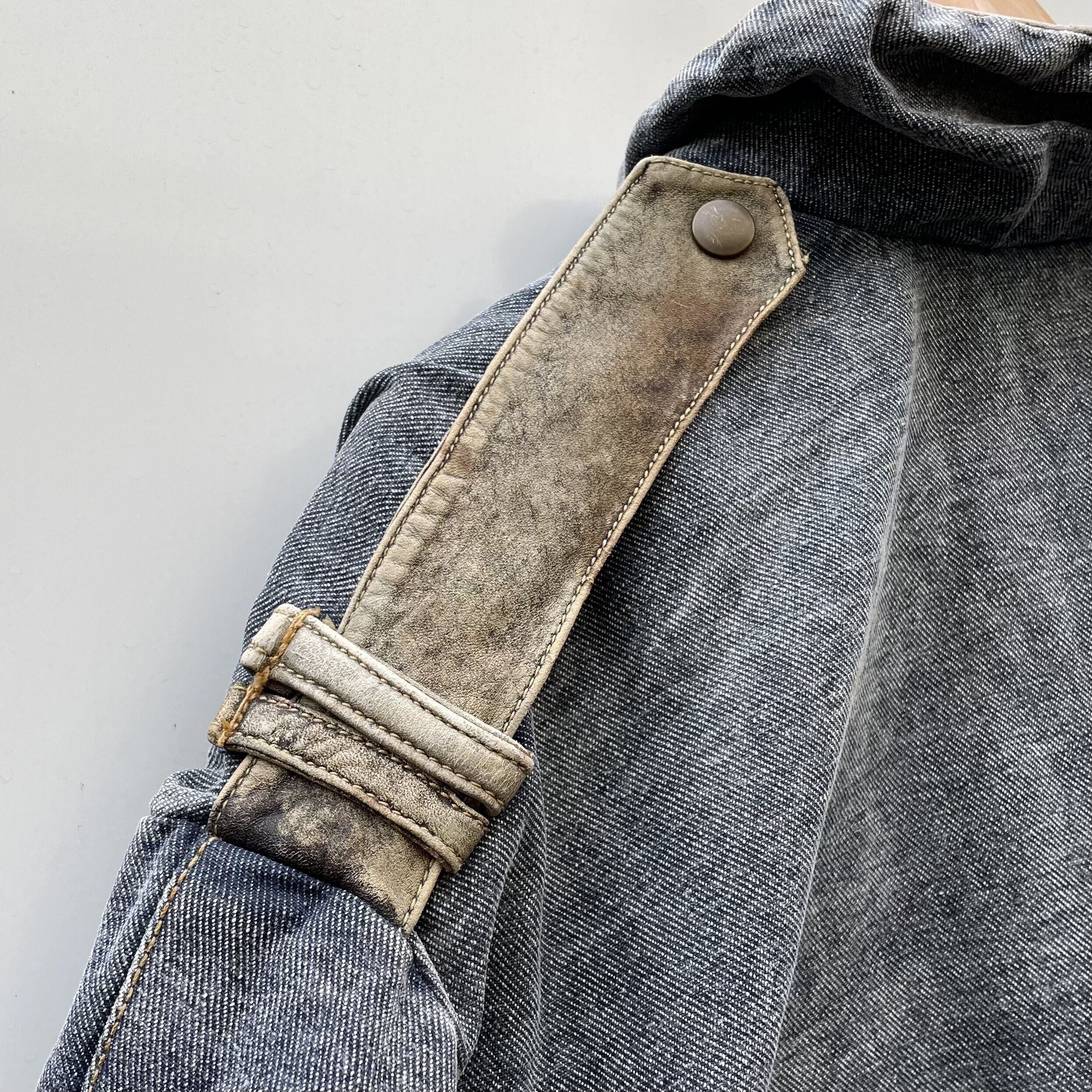 GUESS/ゲス レザー切り替えダブル Gジャン 90年代 Made in USA (USED) ・90年代アイテム ・ウォッシュドブラックデニムxブラック系レザー ・左胸にロゴネーム ・6つのスナップボタンで開閉、ダブル合わせ ・両サイドと袖先にレザーアジャスター / ・レザーエポレット ・ハンドウォームポケット ・薄手の裏地に大きくロゴプリント Size/S 実寸 着丈 約65cm 肩幅 約56cm 身幅 約63cm 袖丈 約58cm 着用感が見られますが、目立ったヨゴレやダメージは見られません。 Made In USA ~コメント~ 90年代、ゲスのレザー切り替えダブルGシャンになります。 ウォッシュドブラックデニムxブラック系レザー、左胸にロゴネーム、6つのスナップボタンで開閉、両袖、両サイドにレザーのアジャスター、レザーのエポレットが付いたデザインです。 縦横ほぼ同寸のボックスシルエットになります。 サイズ表記はS、メンズのM~L程度のサイズ感とお考えください。 男女共に着用いただけます。 モデルは158cmです。 状態をご納得頂いた上での購入とさせていただいております。状態を確認されたいお客様はご来店の上、お買い上げ下さい。